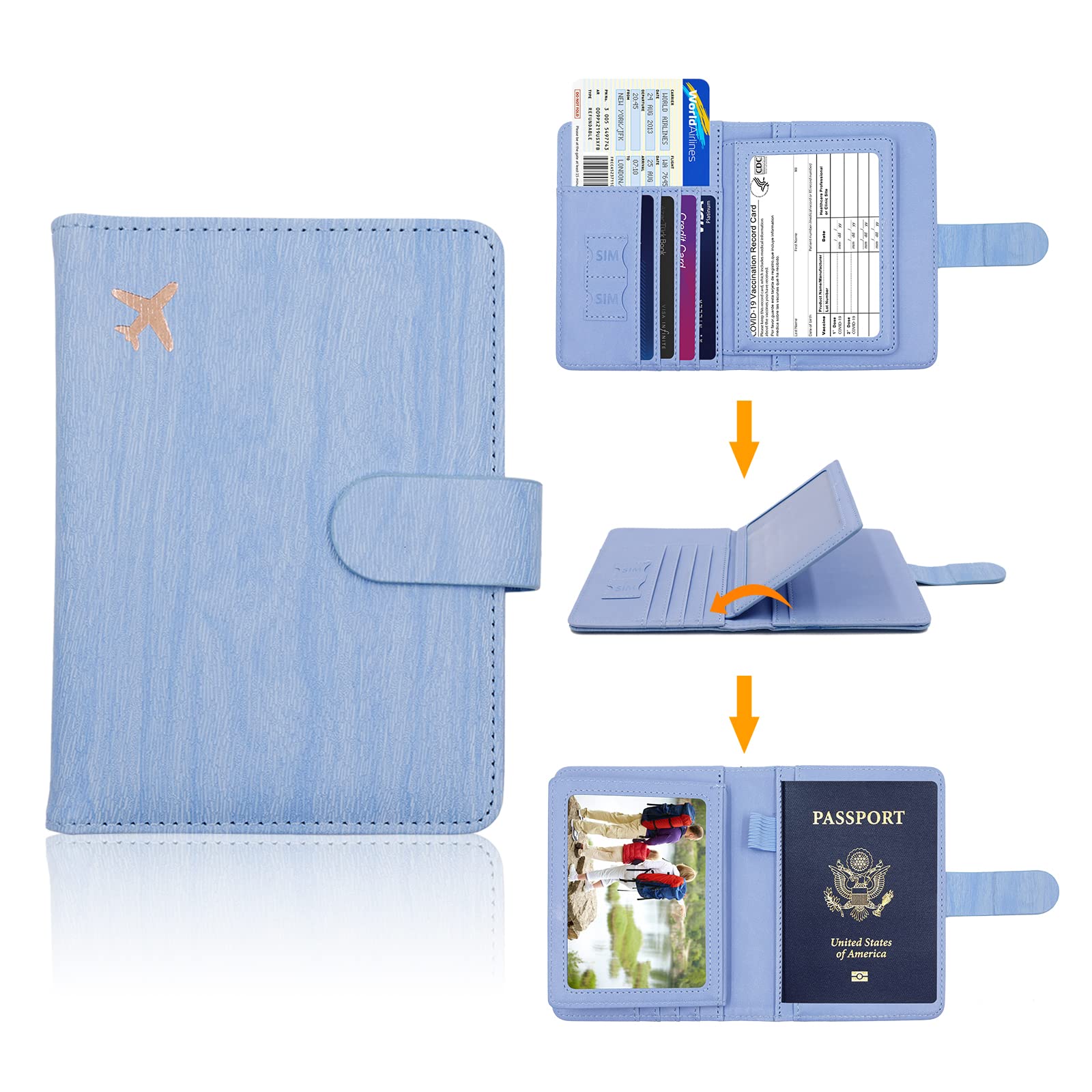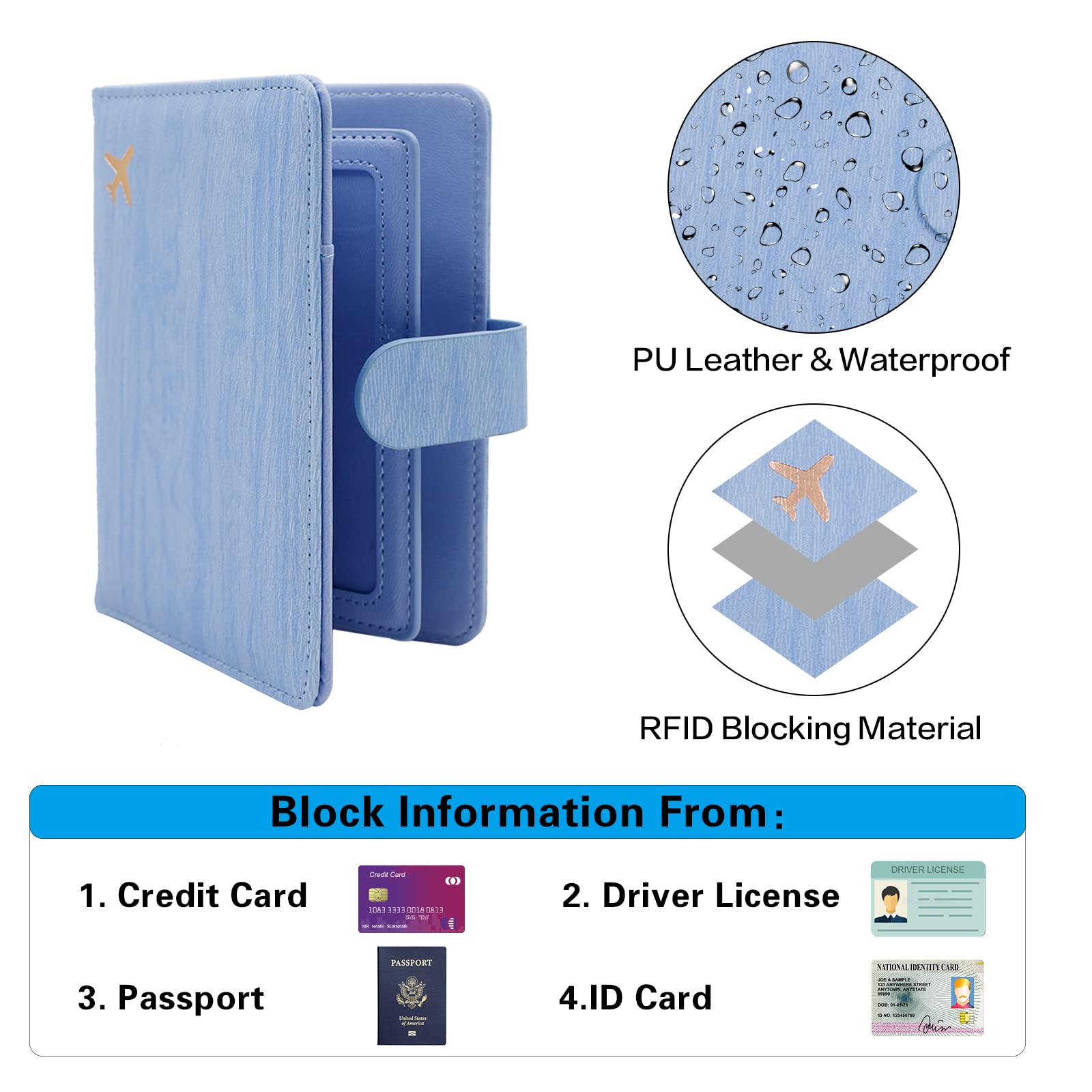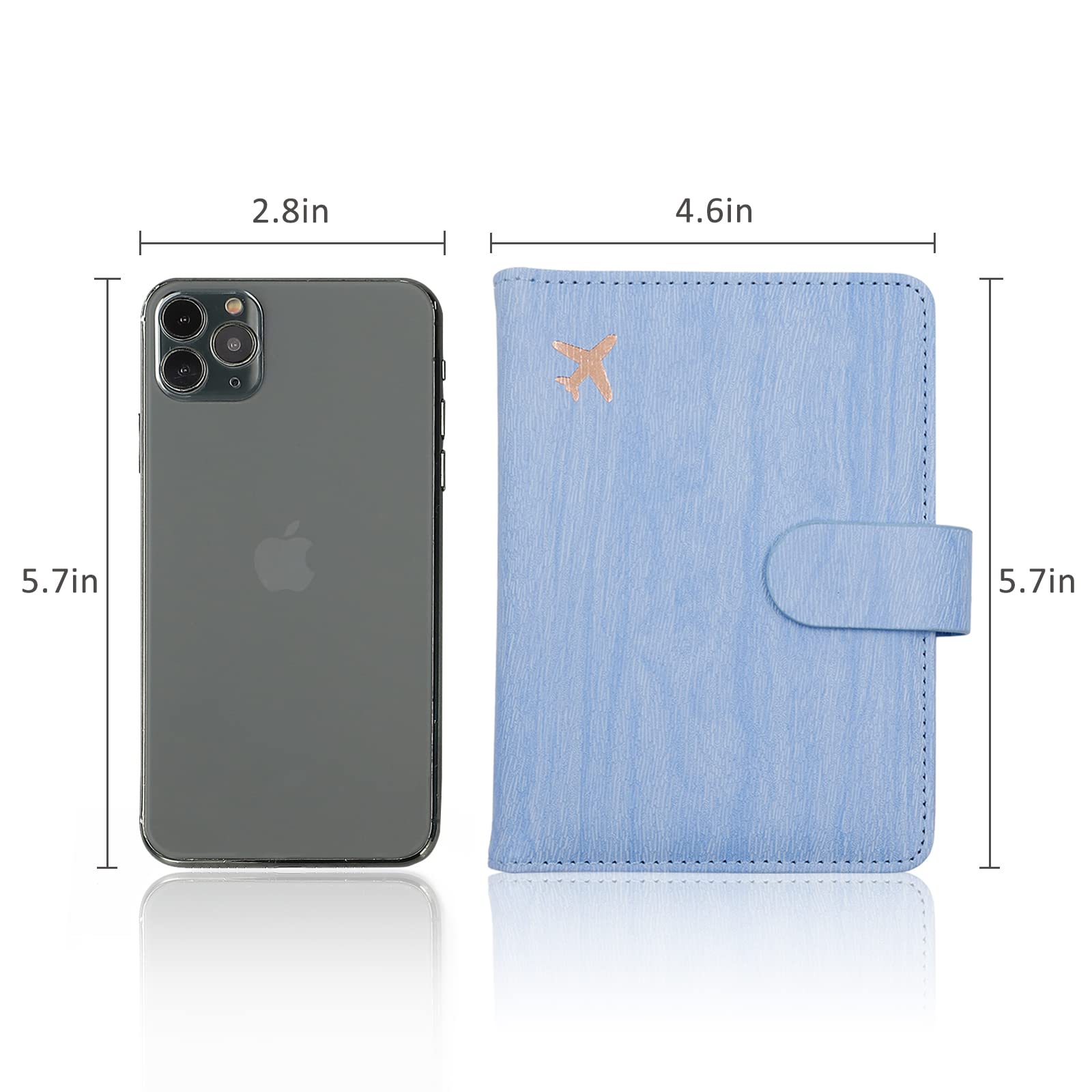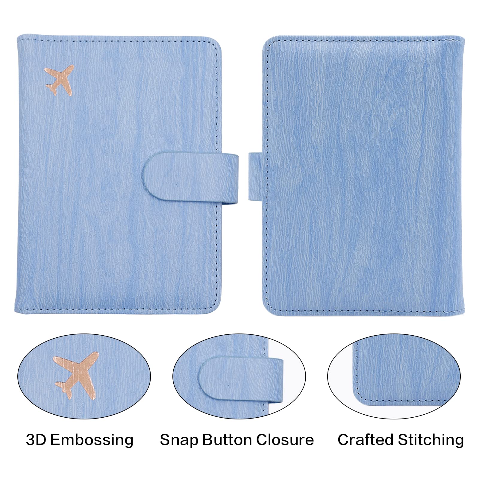【Snap Button Closure and Security Protective】The passport holder with the hidden magnetic snap button closure design, which is safe and reliable to protect your travel items from being lost,to provide dual protection.Besides,RFID blocking shield material inside, Our passport case has a material engineered specifically to block 13.56 MHz or higher RFID signals and protect our important private information stored on your passport and credit cards from unauthorized scans.