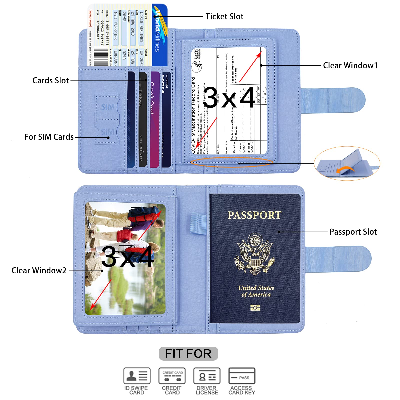 【Beautiful Combo Design】Our passport holder combo has 2 clear plastic slot and 1 passport holder slot to combine our passport,air tickets and some cards,and the other clear plastic slot to hold some important documents such as our ID card or driver's licenses which can ensure that we do not forget to take, or even our family portrait.