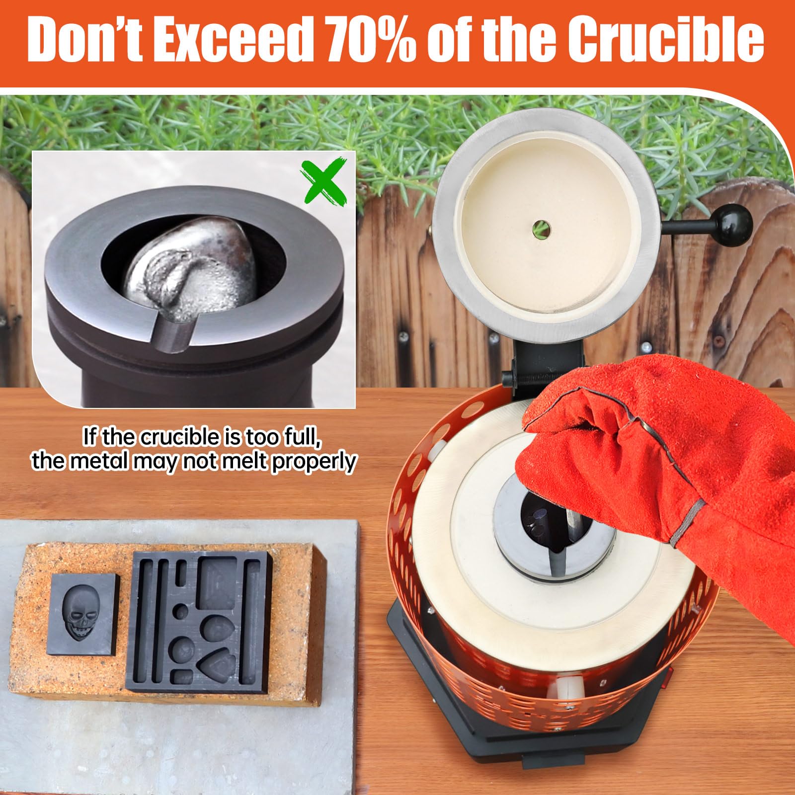 【ALL-IN-ONE SMELTING KIT】Get ready to melt with ease! TOAUTO TRF3000 Smelting Furnace Kit comes with everything you need: TRF3000 melting furnace, 3KG graphite crucibles, 1KG graphite crucible, NEW 10 Holes ingot molds,tongs, gloves and Instruction manual. Whether you're a seasoned pro or a beginner, this kit has your back. Get yours today and let the smelting adventures begin!
