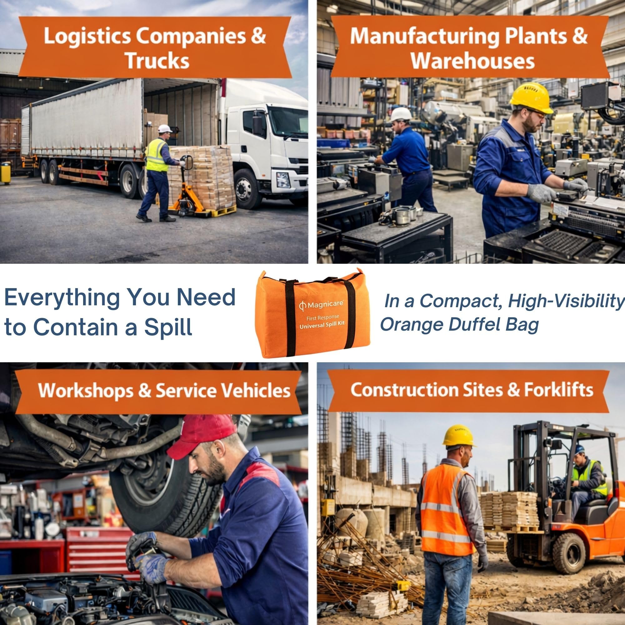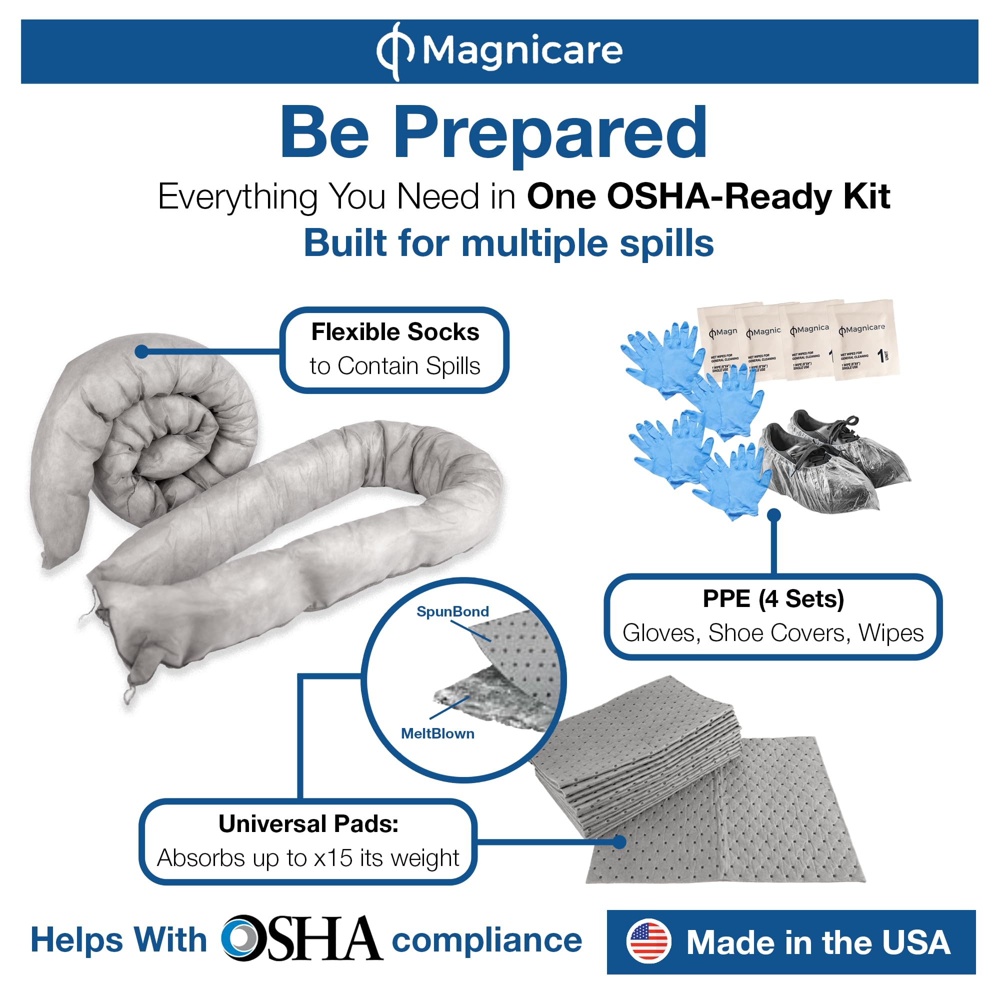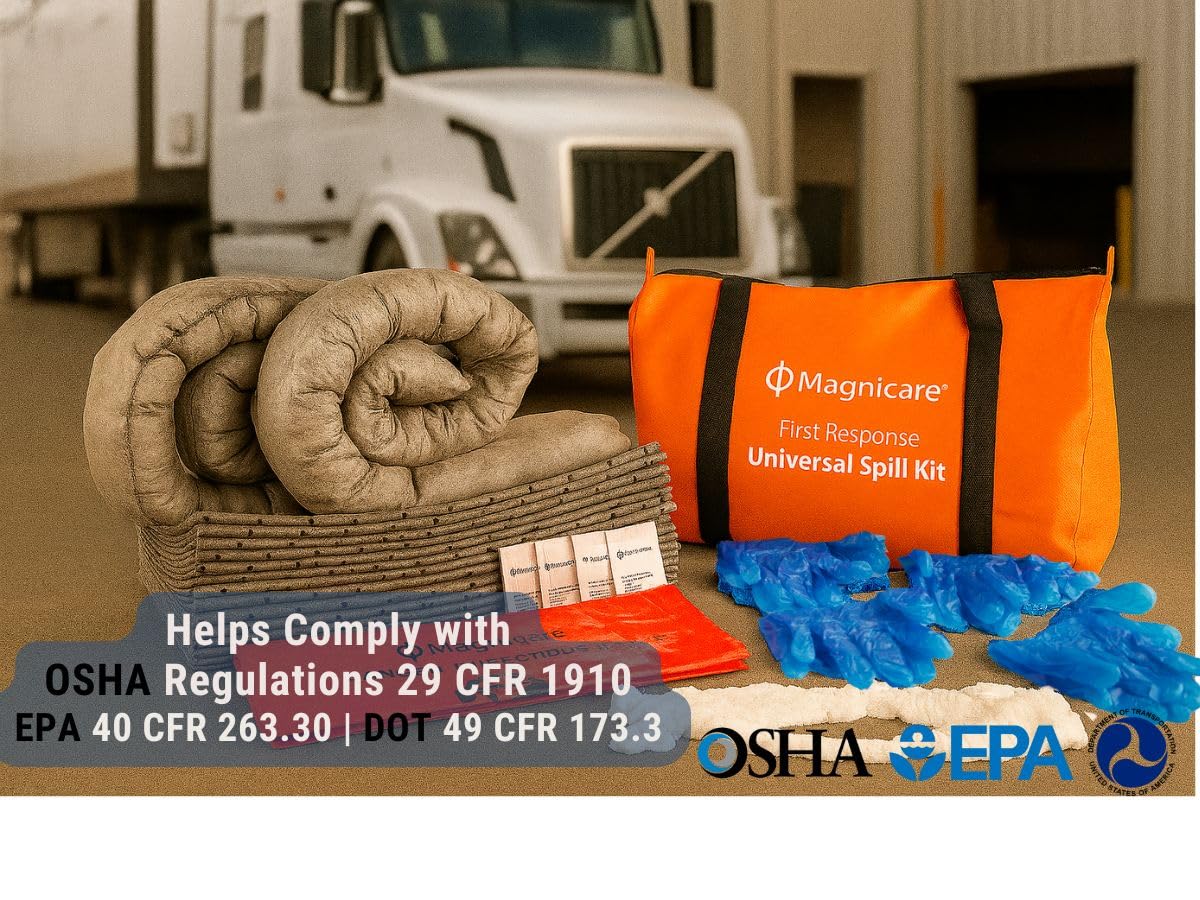 Regulatory Support – Helps comply with OSHA 29 CFR 1910.22, 1910.120 & 1910.107 for maintaining clean, dry floors. Supports EPA 40 CFR 263.30(a) & 263.31 for hazardous spill response, and aligns with DOT 49 CFR 173.3(c)(2) by including proper absorbents for transportation-related incidents.