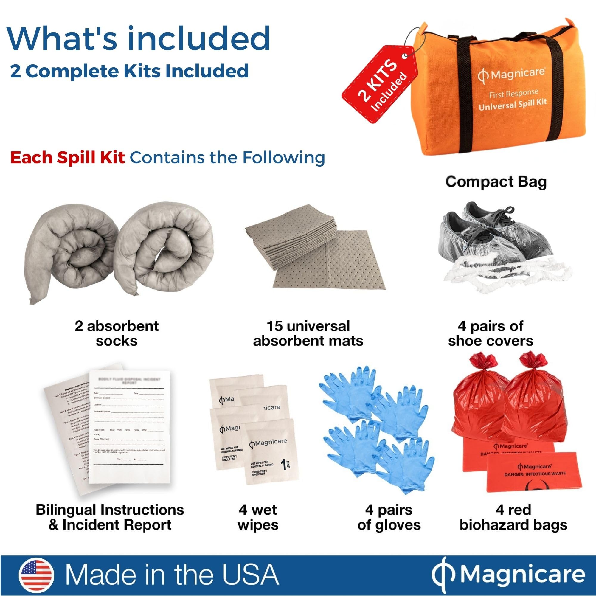 2 Complete Kits in 2 Compact Duffel Bags- Each duffel bag includes: 15 universal absorbent mats, 2 absorbent socks, 4 pairs of gloves, 4 pairs of shoe covers, 4 red biohazard bags, 4 wet wipes, bilingual instructions, and a spill report form.