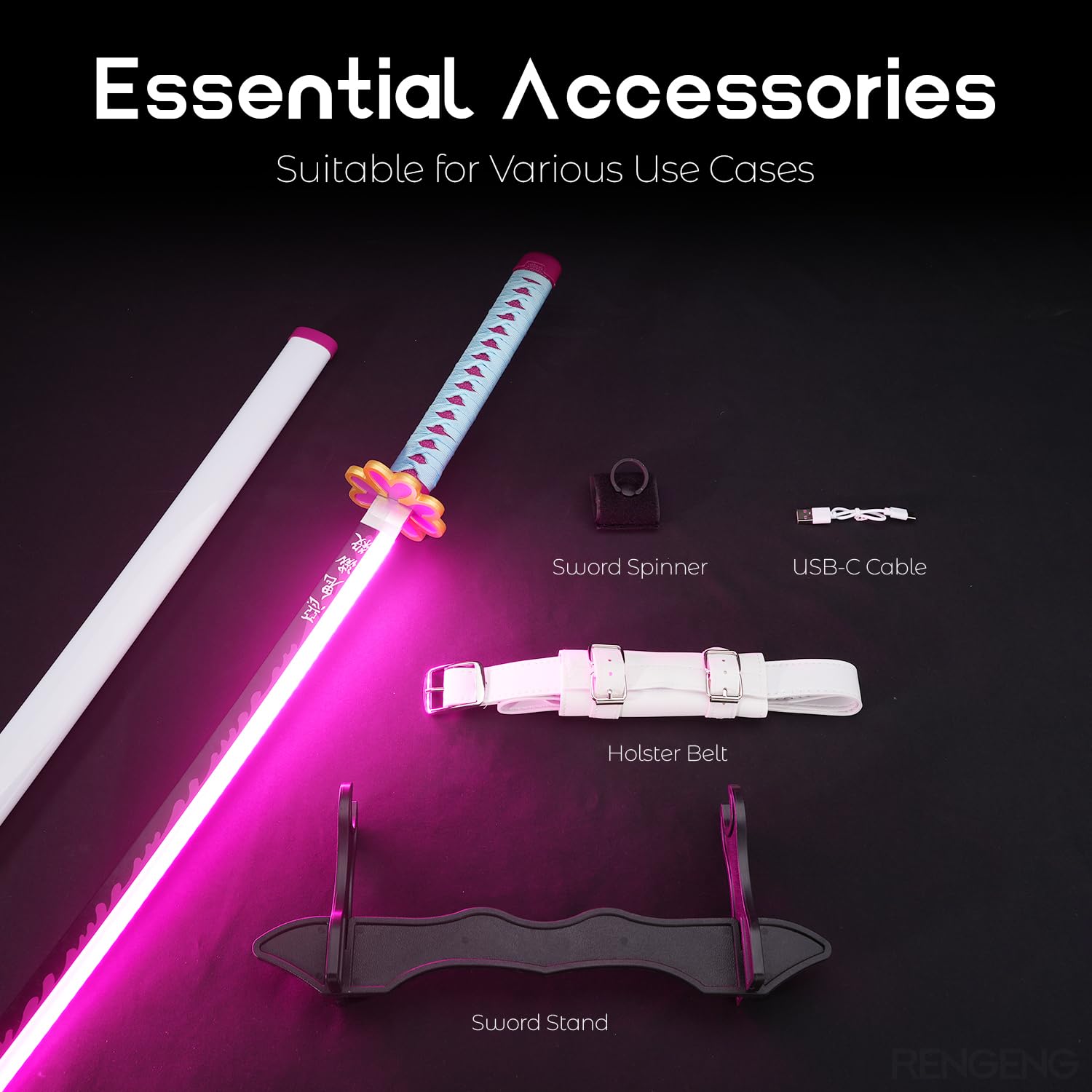 [Packaging Includes] This package contains: Light Up Sword x1, Holster Belt x1, Sword Stand x1, Sword Spinner x1, and USB-C Cable x1