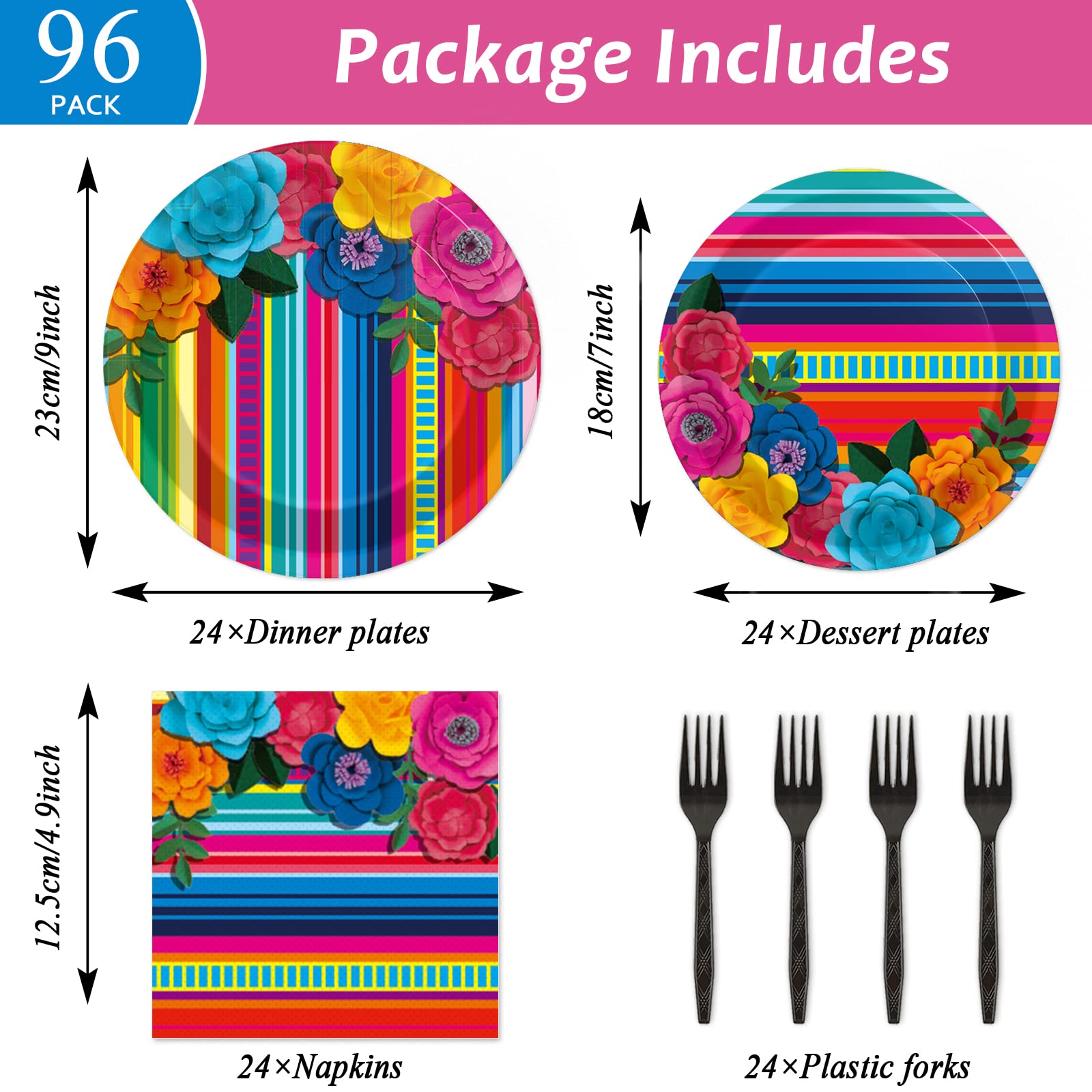 What you will get: These Mexican fiesta plates and napkins party supplies include a total of 96 pieces of disposable tableware. You will get 24×9 inches Mexican paper plates, 24×7 inches fiesta plates, 24×napkins and 24×black forks.