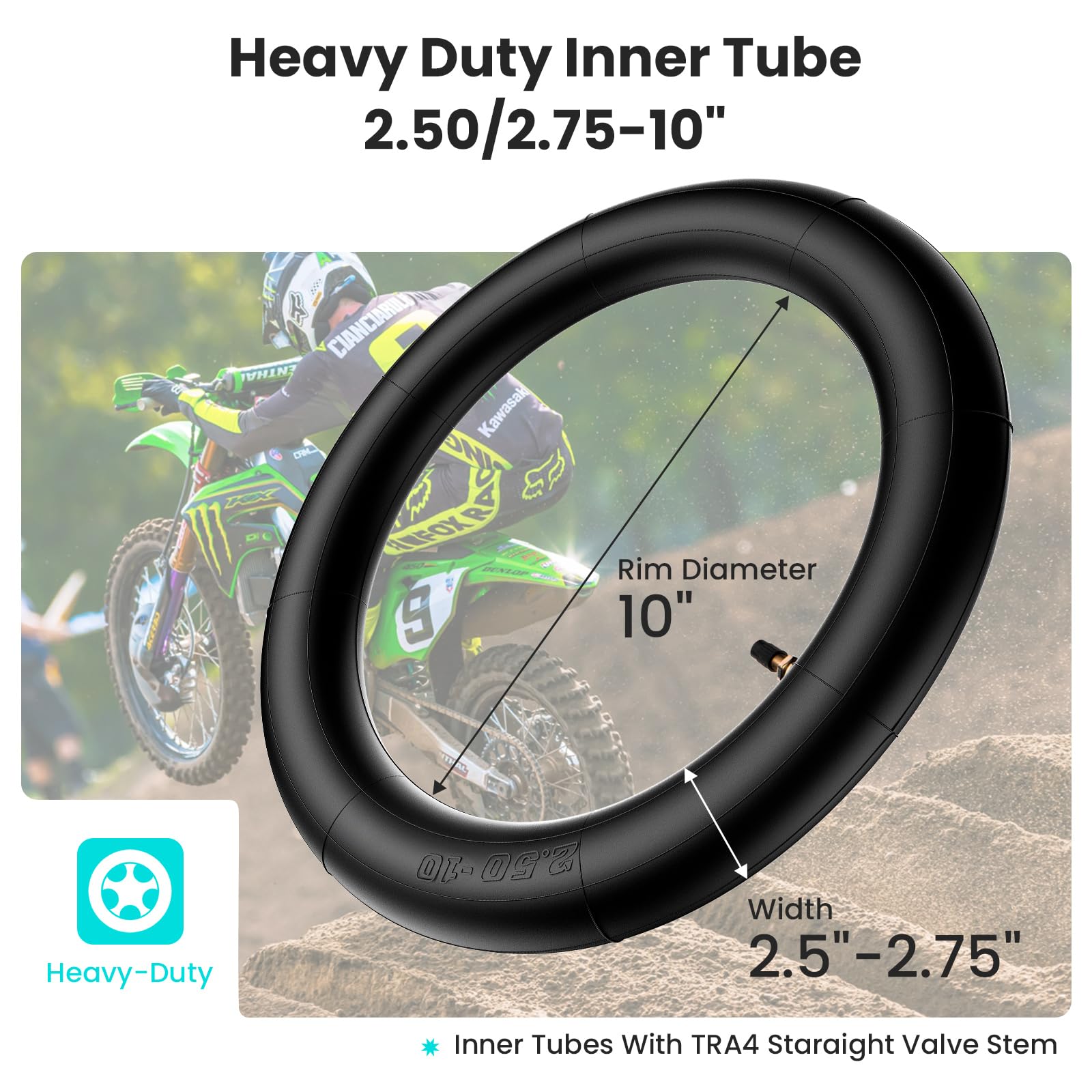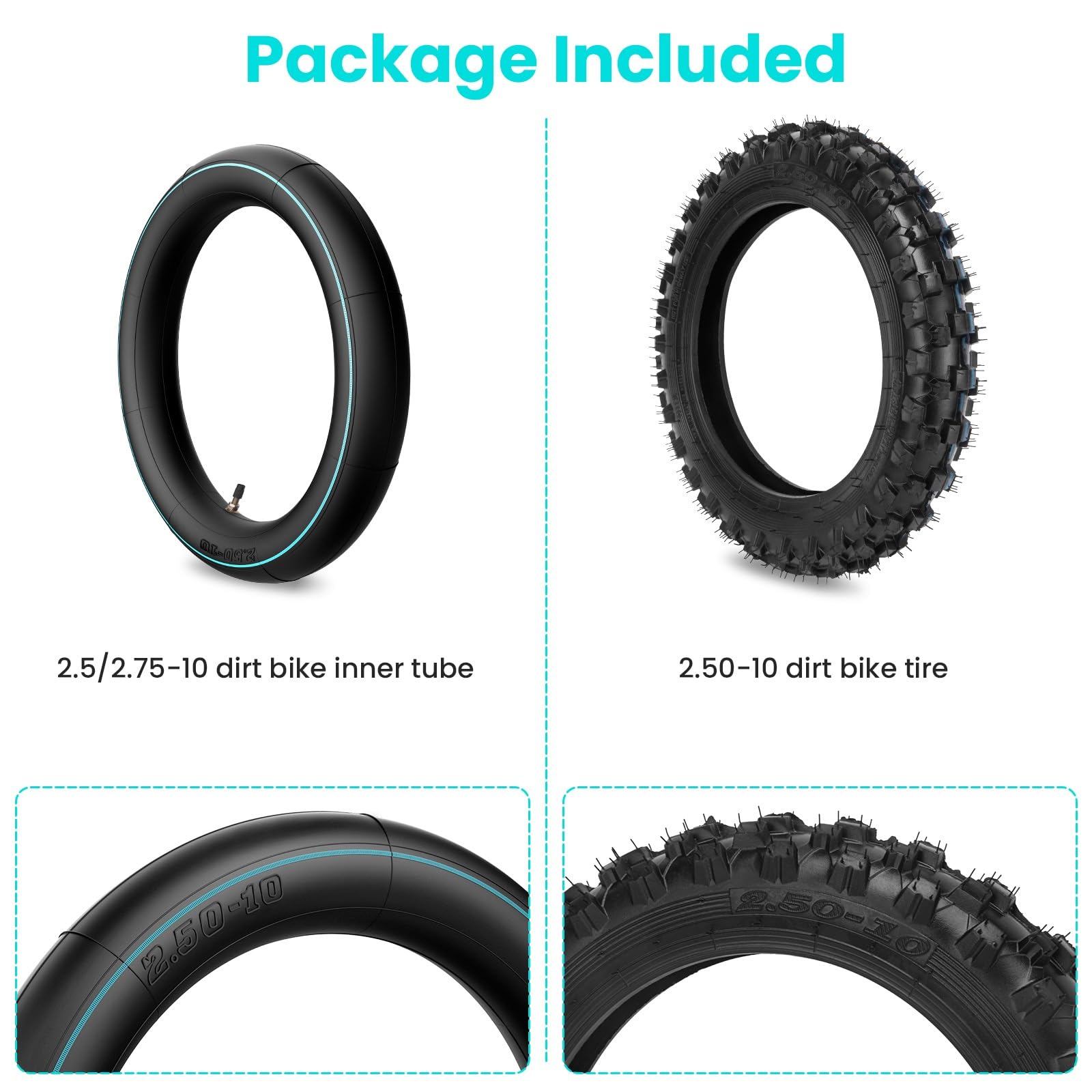 2.50-10 Dirt Bike Tire and Tube,Package: 1* 2.50-10 tire, 1* 2.50-10 Inner Tube.2.5-10 Tire Heavy Duty,New, without any dry rot or holes, this tire, and inner tube set comes with the assurance of high-quality. The knobby tire provides an excellent grip with its open treads made from all-season tread rubber.
