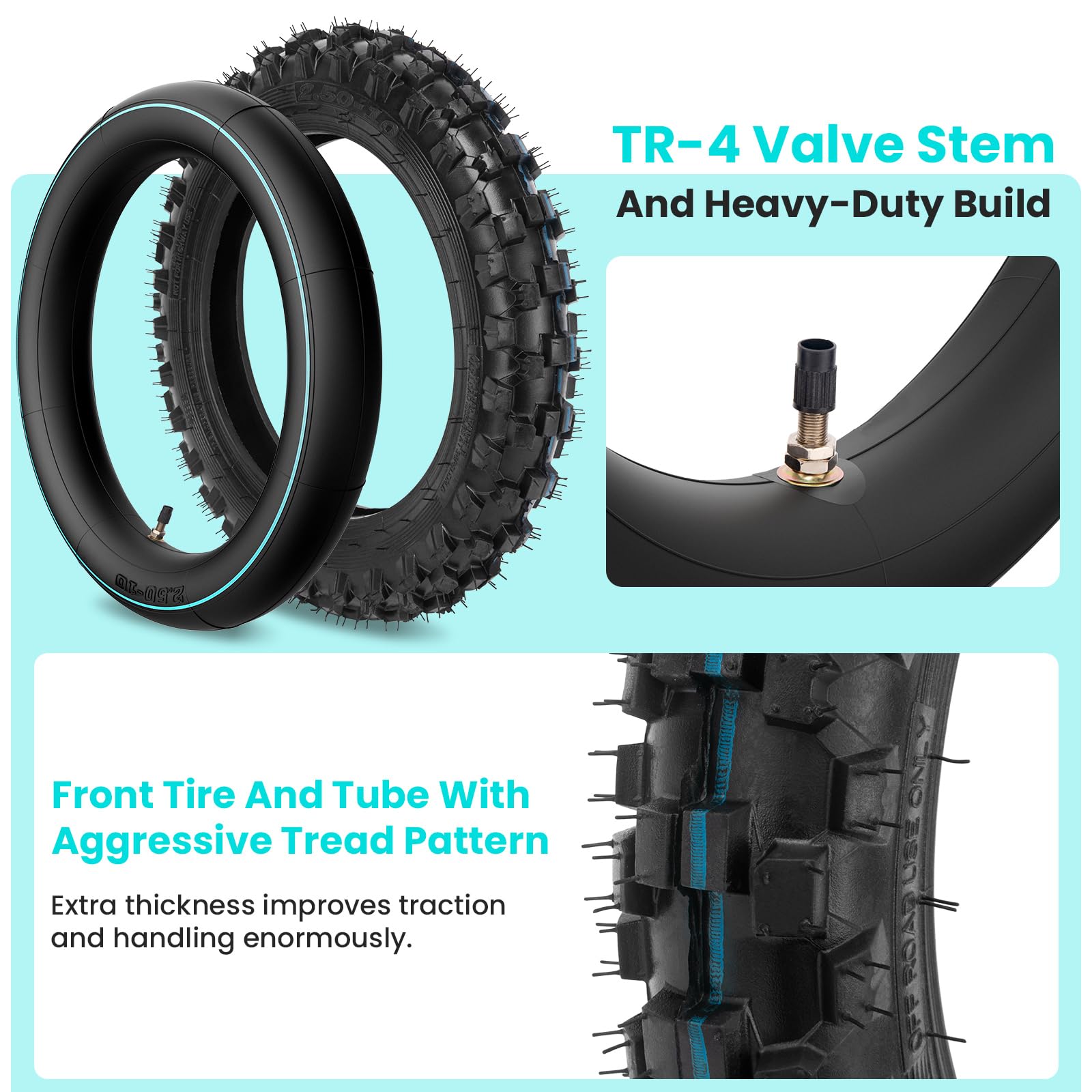 Dirt Bike Replacement Tire And Inner Tube Set,Explosion-Proof Inner Tube, Made with thick and shock-absorbent butyl rubber, this inner tube will not only add comfort to your ride but also keep you safe. With a self-sealing surface, the inner tube will instantaneously create an airtight seal that will prevent punctures from progressing into a catastrophic explosion. Made with thick and shock-absorbent butyl rubber, this inner tube will not only add comfort to your ride but also keep you safe.