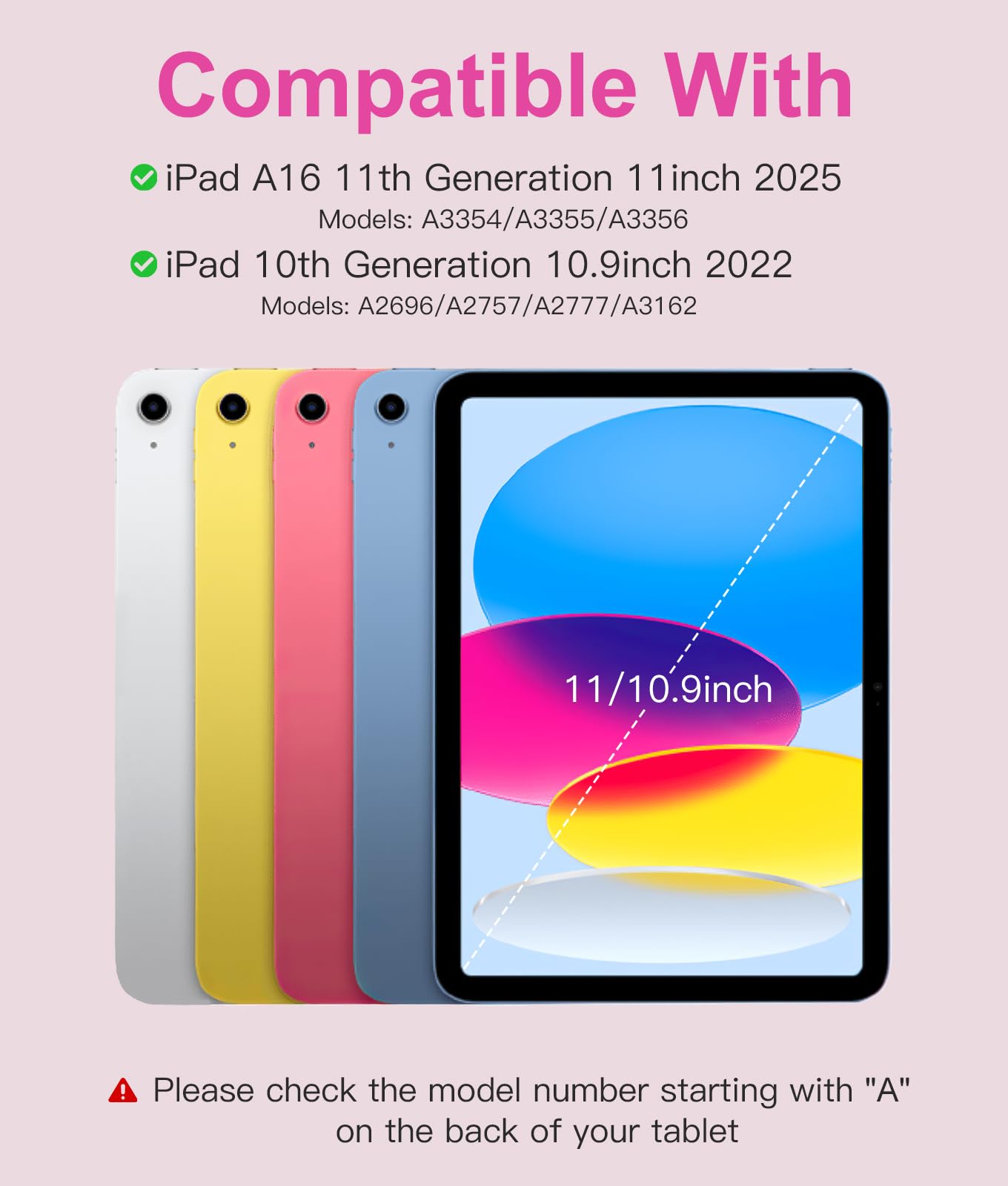 For iPad 10th Generation Case with Keyboard 10.9 Inch: This keyboard case compatible with iPad A16 11th Generation 11-inch 2025(Model: A3354, A3355, A3356), compatible with iPad 10th Generation 10.9 inch 2022(Model: A2696, A2757, A2777, A3162). Not compatible with any other models. Please check the model number starting with "A" on the back of your tablet before purchasing