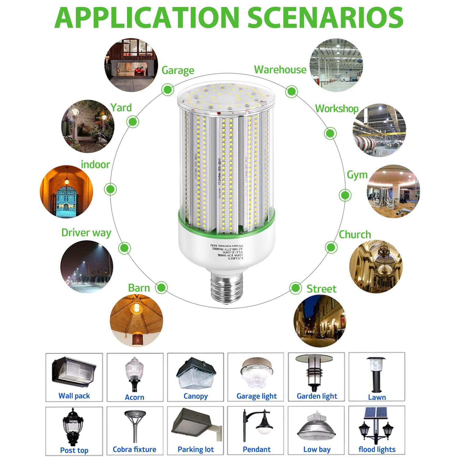 Wide Application:100W E39 Mogul base Led bulb Working voltage:AC100-277V Great for indoor outdoor Street and large Area Light,garage light,warehouse light barn light,Parking Lot High Bay light patio courtyard garden light shop light work light celling light grow light wall pack Post Top,acorn,low bay shoebox Light fixture etc,Anywhere need bright light with LED replacement bulbs or LED retrofit kits