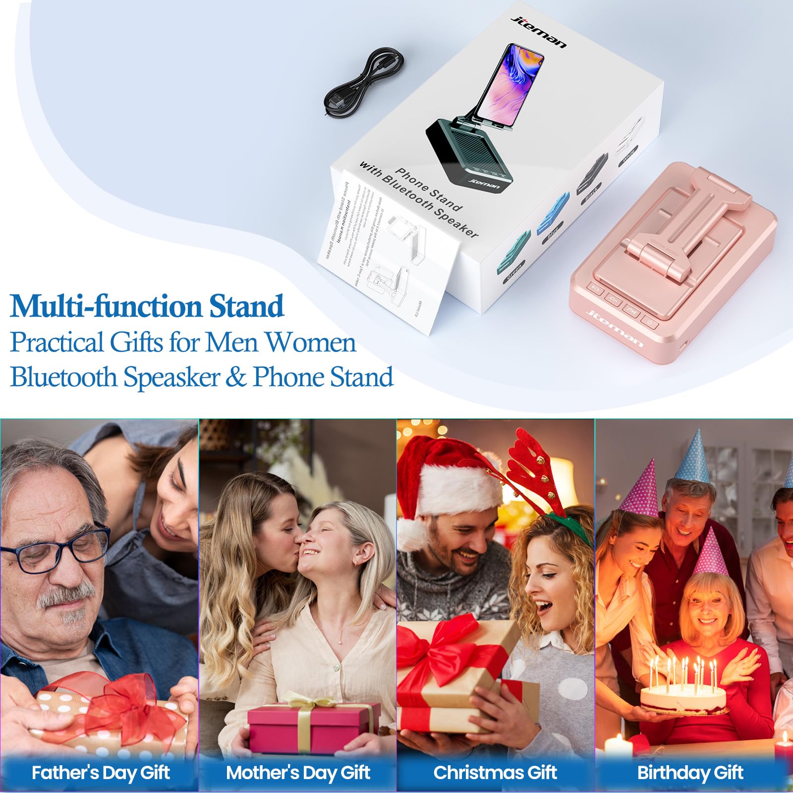 2 in 1 Bluetooth Speaker + Phone Stand:Jteman cell phone stand with bluetooth speaker gadget gift, the phone stand allows you to free your hands,the bluetooth speaker makes your phone sound louder and clearer,The built-in microphone speaker can help the elderly hear the sound more clearly.This cool gadgets makes a practical birthday gifts for men and women.【Please NOTE: This device cannot charge cell phones】