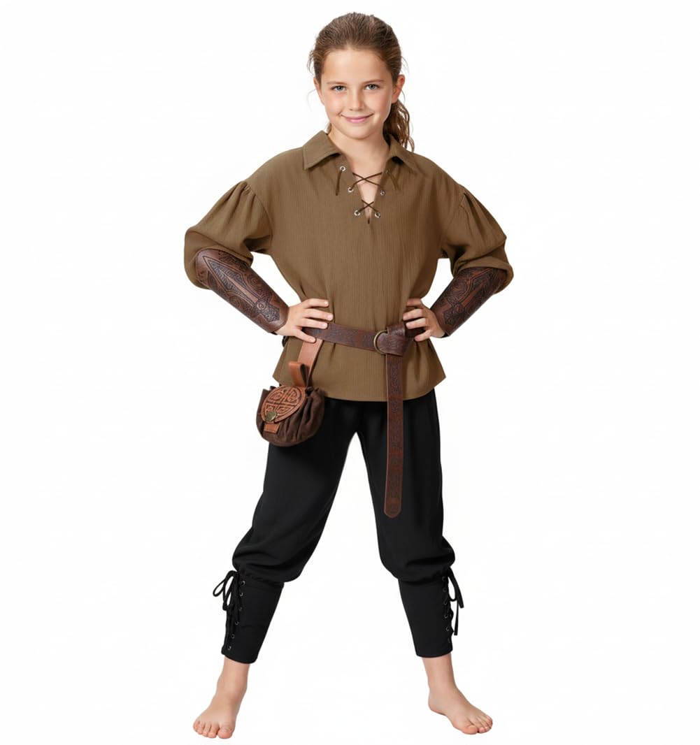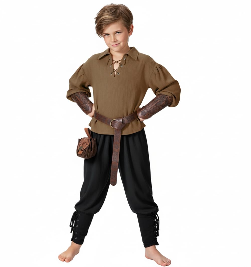 【Tunic Design】: Boy's Halloween costume shirt, vintage role-playing shirt, long sleeves, lace up neckline, loose fit, elastic wide cuffs, dropped shoulders, unique historical era style.