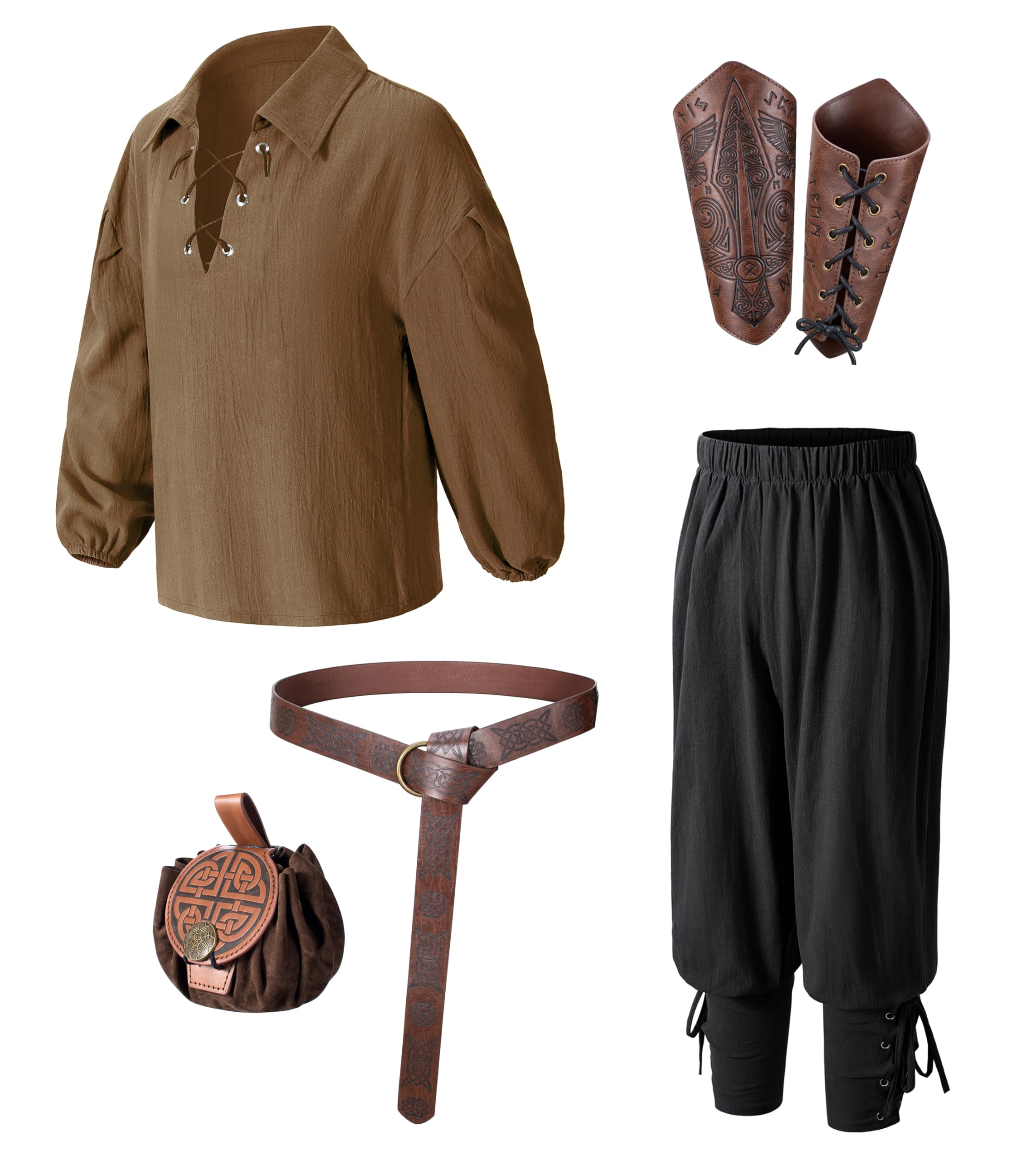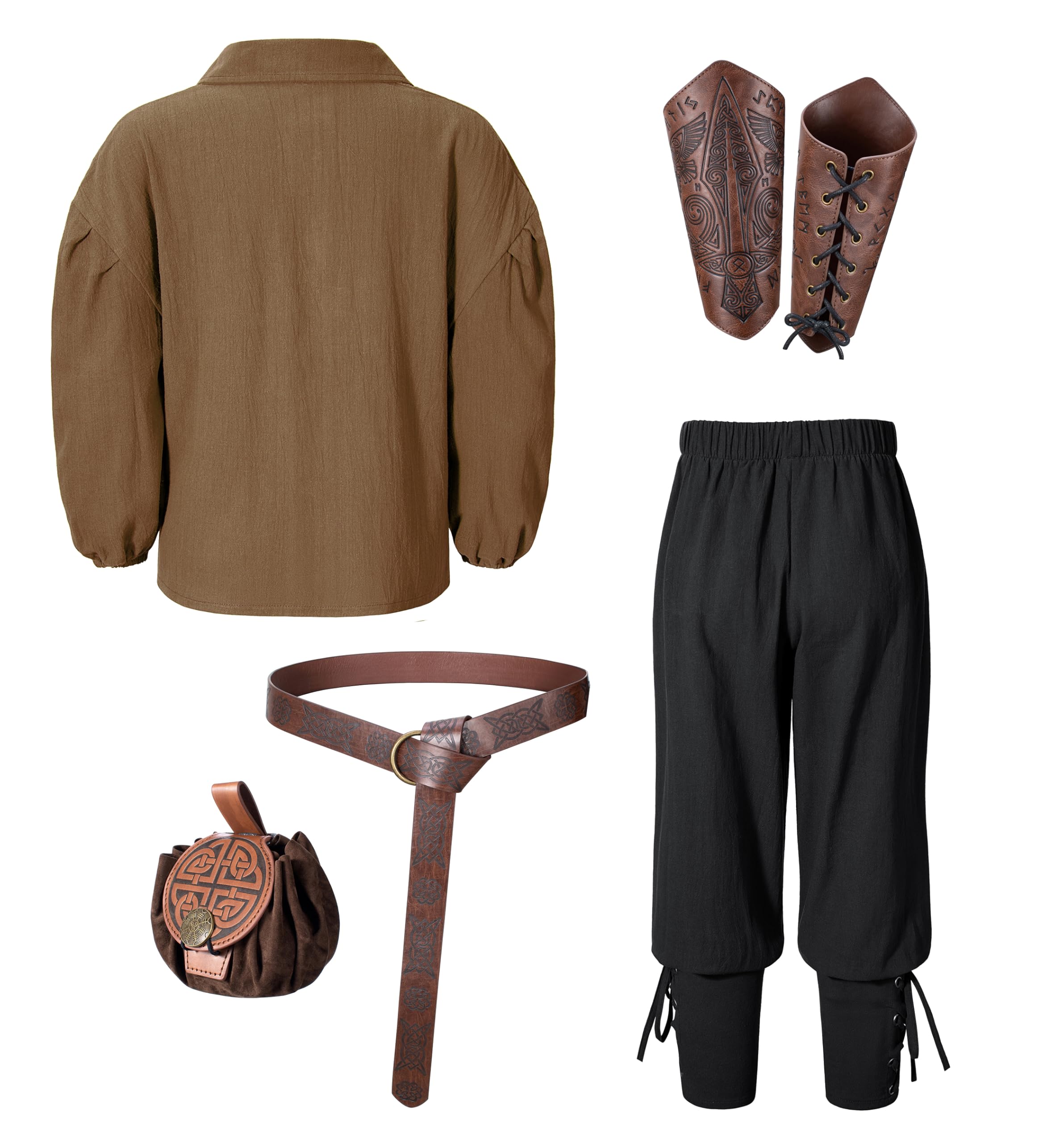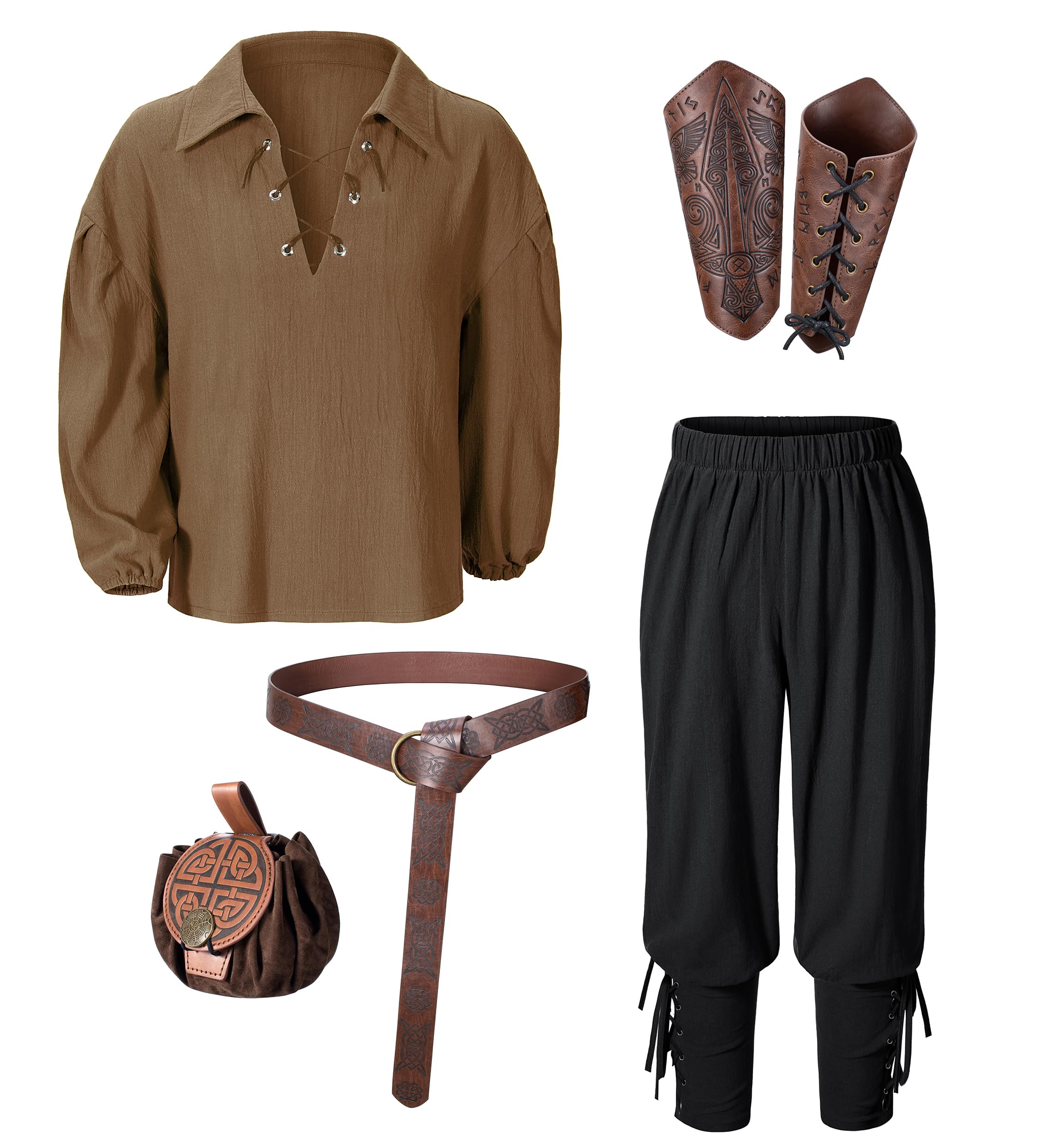 【Package Includes】6pcs set:Medieval Shirt,Vintage Pants,Leather Belt,Waist pouch,1 pair of arm Bracers.