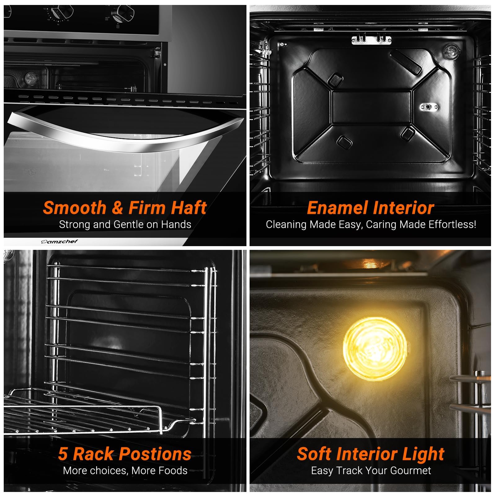 [EASY TO CLEAN] Experience the convenience of the enamel inner liner, ensuring that maintaining the oven is a simple and stress-free endeavor. The easily removable oven door and premium tempered glass make it easy to keep your kitchen spotless. The halogen light inside the oven provides a clear view of your culinary creations.