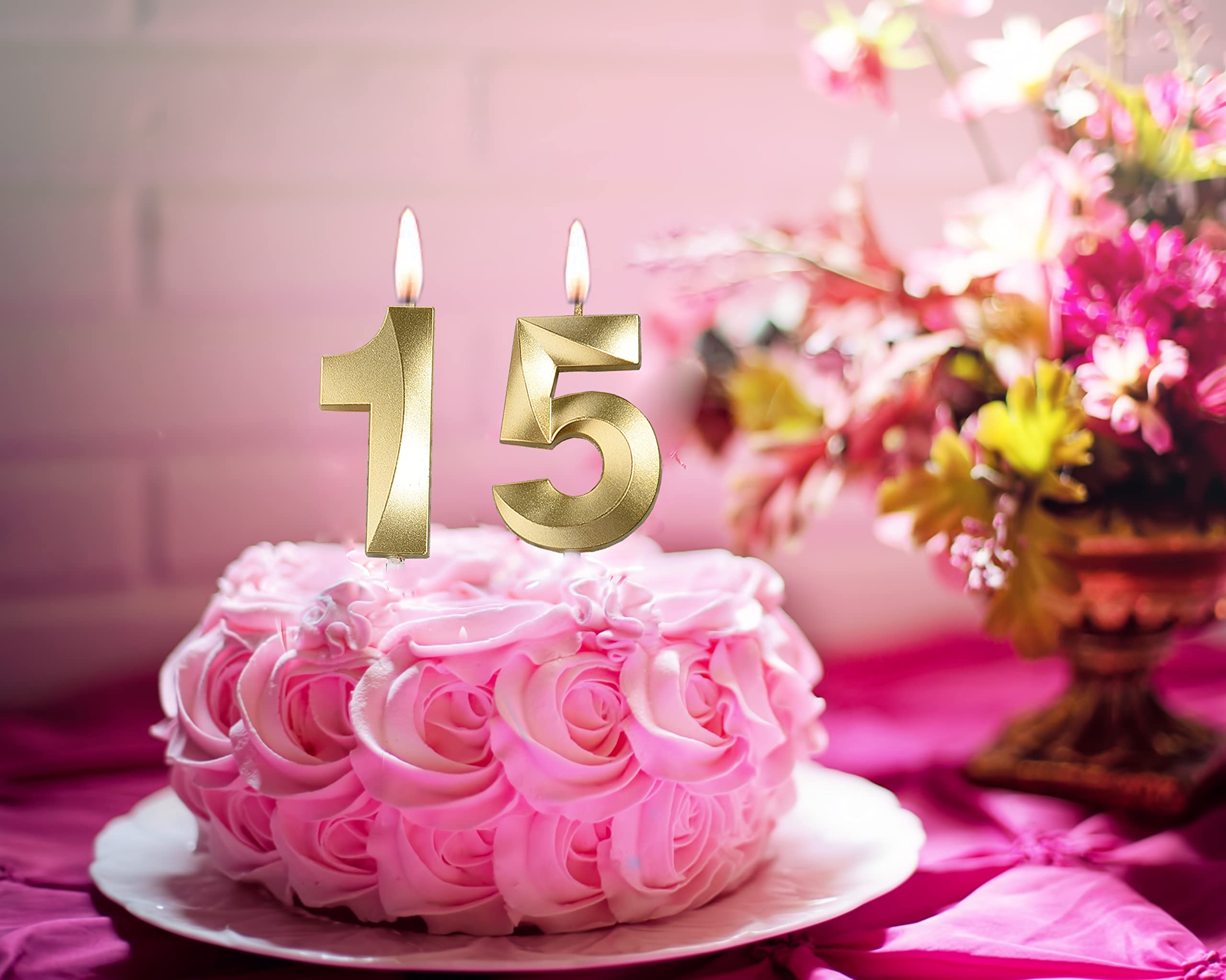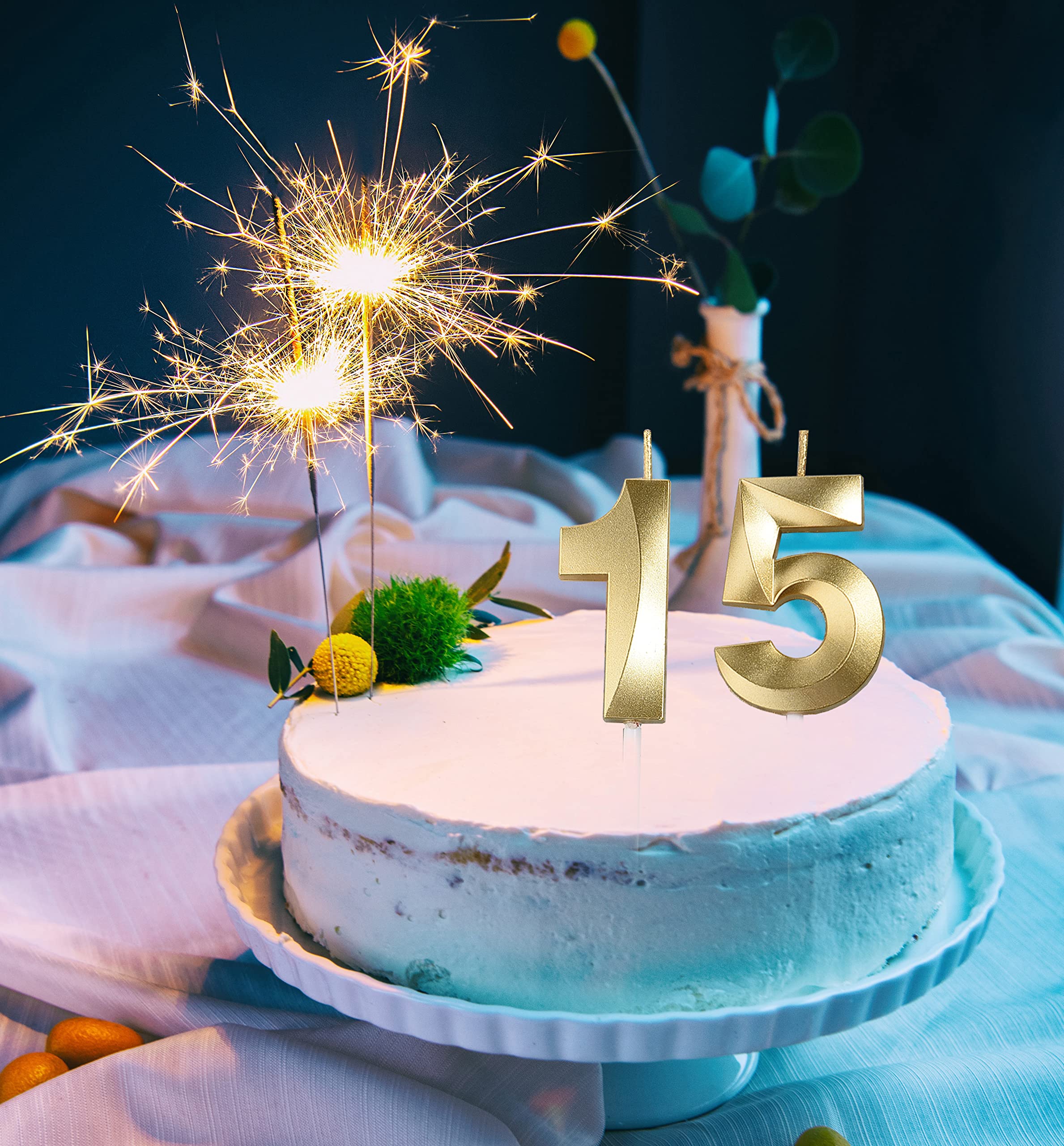 INSTRUCTIONS: Size: Width:1.3 in. Number height: 1.9 in. Total height: 4.8in Color : Glitter Gold Material : quality wax ,smokeless and non-toxic Burning Time :approx 4-5 minutes Package included:2 Pcs ,Gold Number 15 birthday candles PLEASE NOTE: Please keep the candles in shade away from the fire and make sure the size match to your birthday cakes