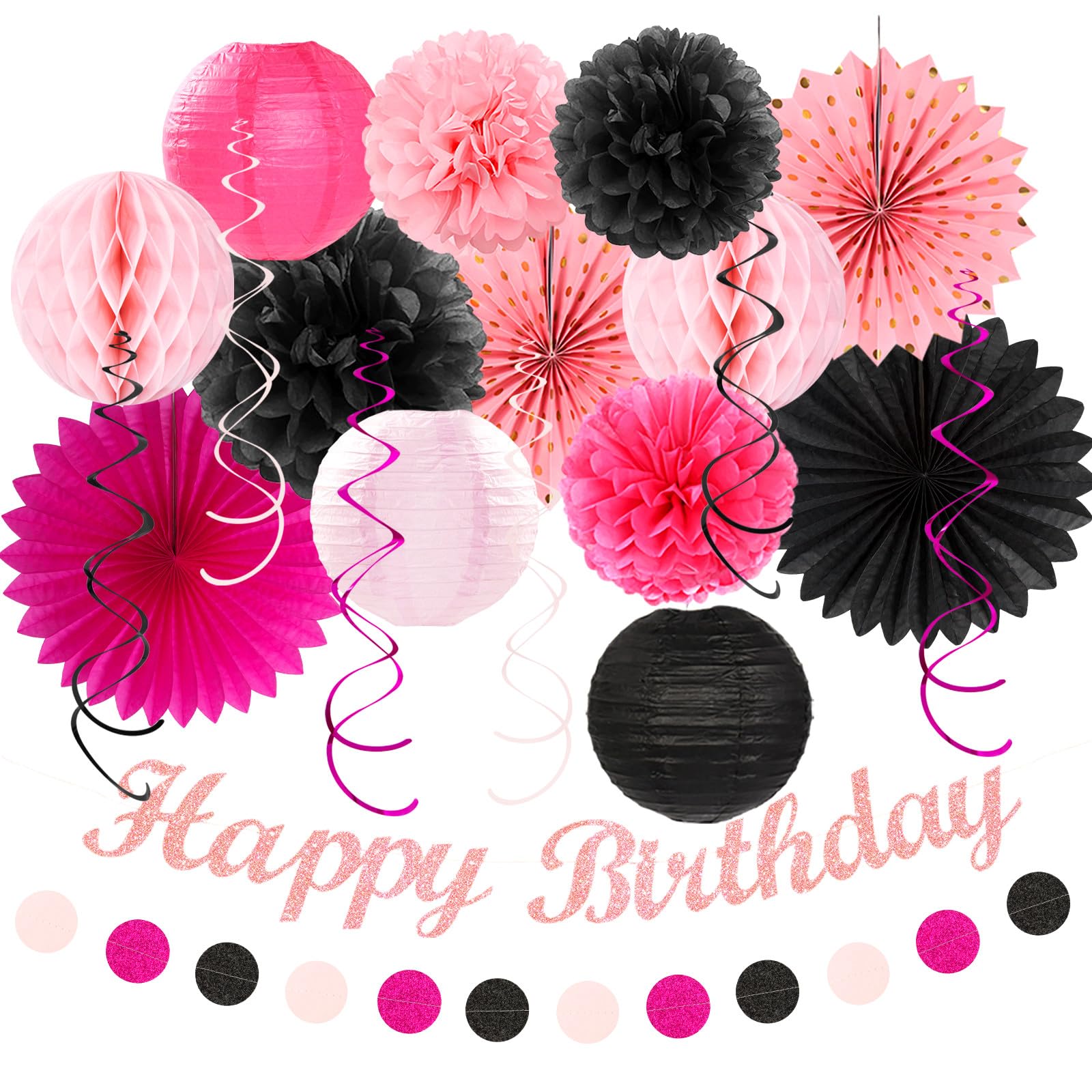 【Hot Pink Black Birthday kits】This kits include 1pcs happy birthday banner, 1pcs circle dots paper banner, 4pcs tissue flower pom poms: 3pcs 10" and 1pcs 12" , 3pcs 8inch paper honeycom ball, 2pcs 8inch paper lantern, 4pcs 12inch paper fan, 6pcs Paper swirls hanging streamers 【Unique Birthday Party Decoration design】elegant color, use our high-quality birthday decorations at your party table and give your guests the details they deserve. It will be a great addition to your birthday theme party. 【Wide Application】This birthday party decorations kit have been used for all kinds of parties and special occasions Perfect for hot pink and black birthday,baby girl women birthday decorations. 【Easy to Assemble】The paper fan and paper lanterns are easy assemble, the birthday banners can be diy, the circle dots paper banner has been assembled but tissue paper pompoms take more time to put together, please diy with the instructions. It will take about 20 minutes in total. 【Quality Guarantee】If you are not satisfied with the color, quality or other aspects,please contact us for a refund or replacement. We have a 30 day refund guarantee for every order.