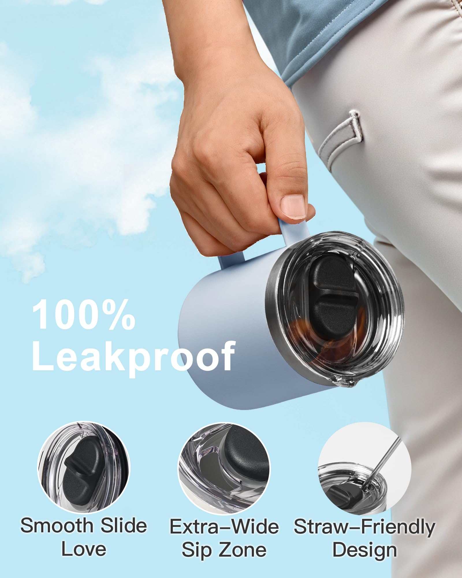 100% Leak-Proof Slider Lid: Exclusive slider lid glides smoothly,settled and locks securely with an airtight seal, staying 100% leak-free even when inverted. You’ll love the effortless sliding action that makes sipping on the go a breeze. Stainless steel coffee mug’s wide-mouth design with soft straws lets you sip comfortably, whether you’re using a straw or drinking straight from the cup!