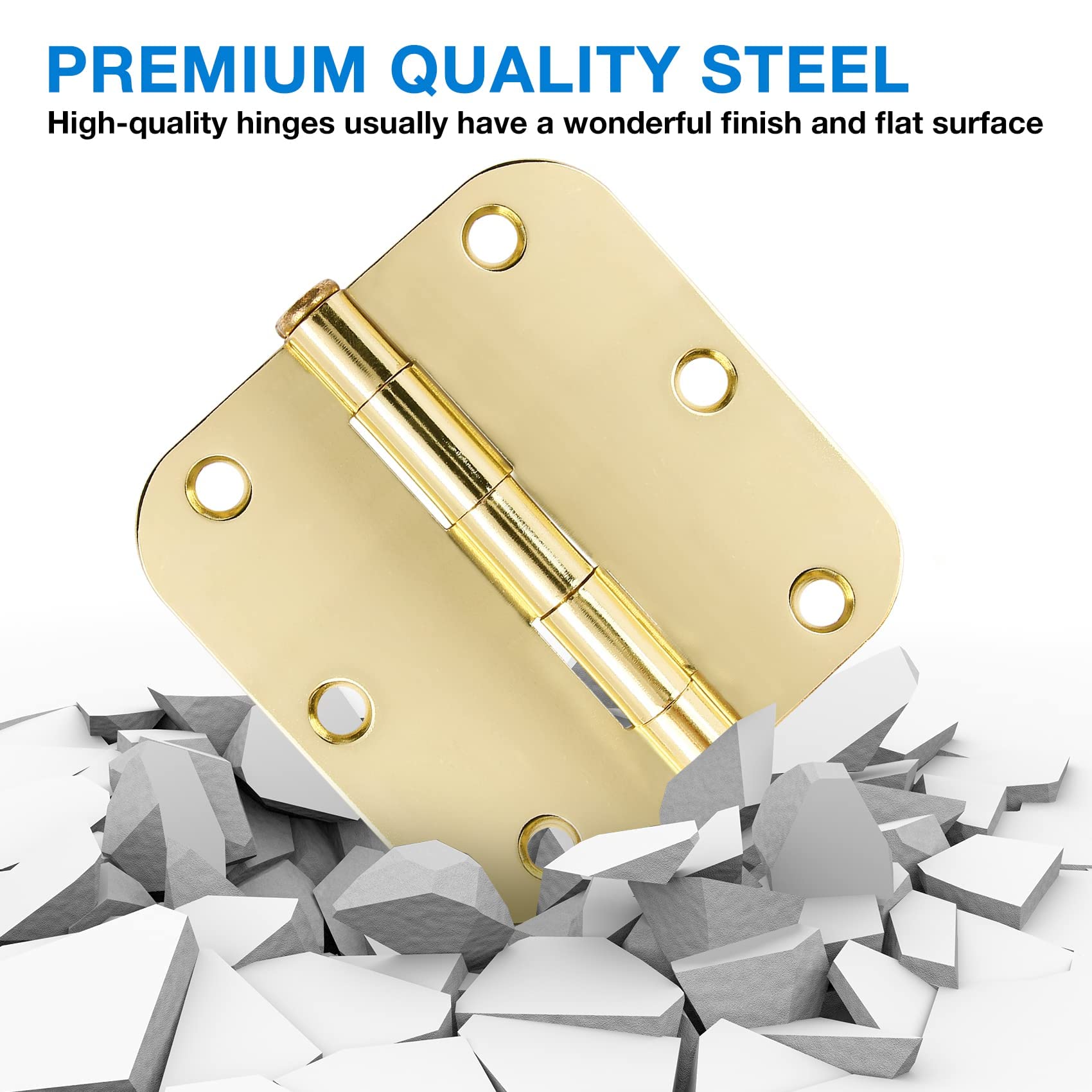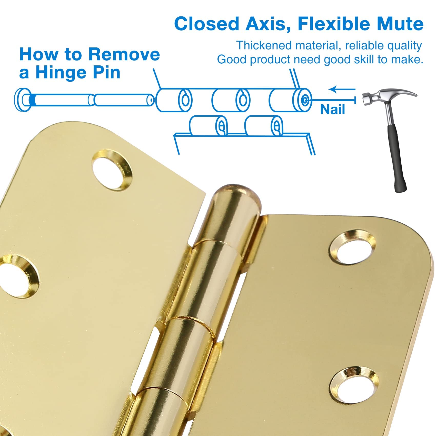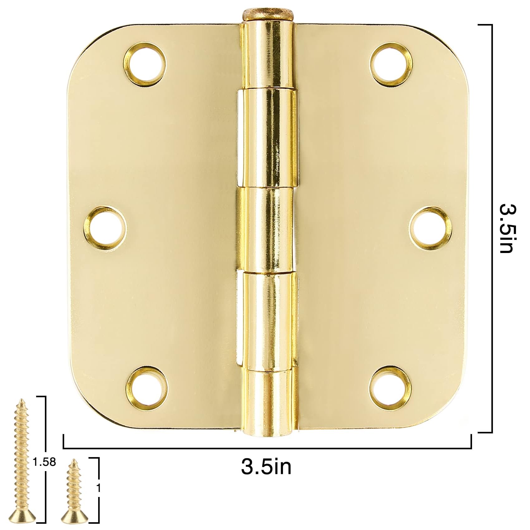 Door hinges Polished Brass 3.5 inch with 5/8 rounded corners and 6 holes for front door,cabinet,wooden box.Safe Oil Rubbed Bronze door hinges 3.5" Includes 18 free screws for quick and easy installation. Polished Brass door hinges can be rotated 270 degrees.The extra long screws will come in handy specially when replacing existing hardware using the same hole pattern.