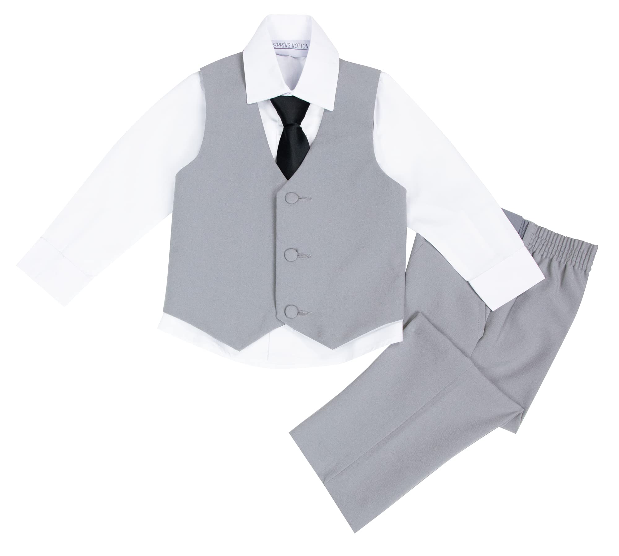 Complete grey suit set designed for babies and toddlers, comprising a grey jacket, grey vest, white shirt, black necktie, and grey pants. Crafted from lightweight material, it's a versatile, affordable and fits comfortable.