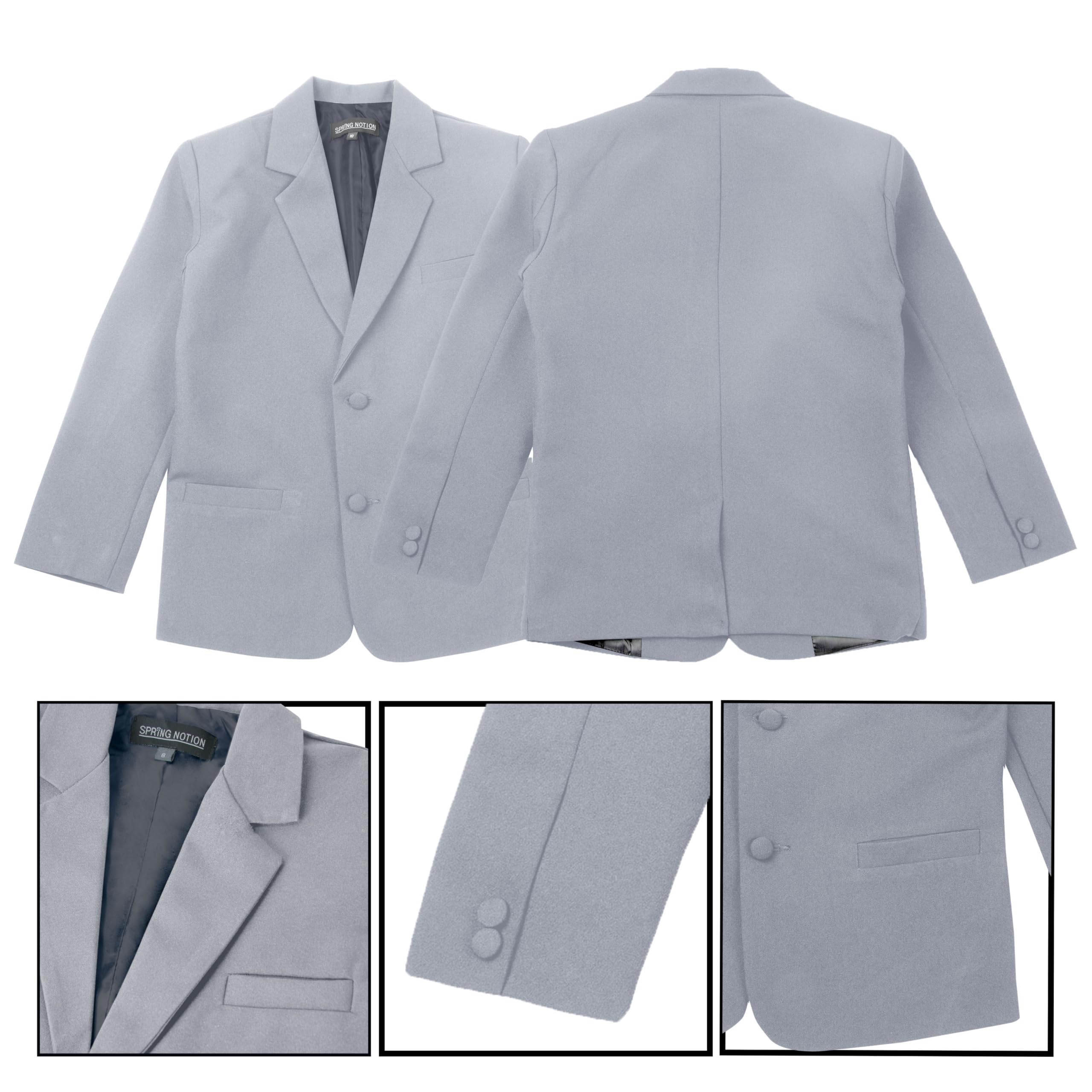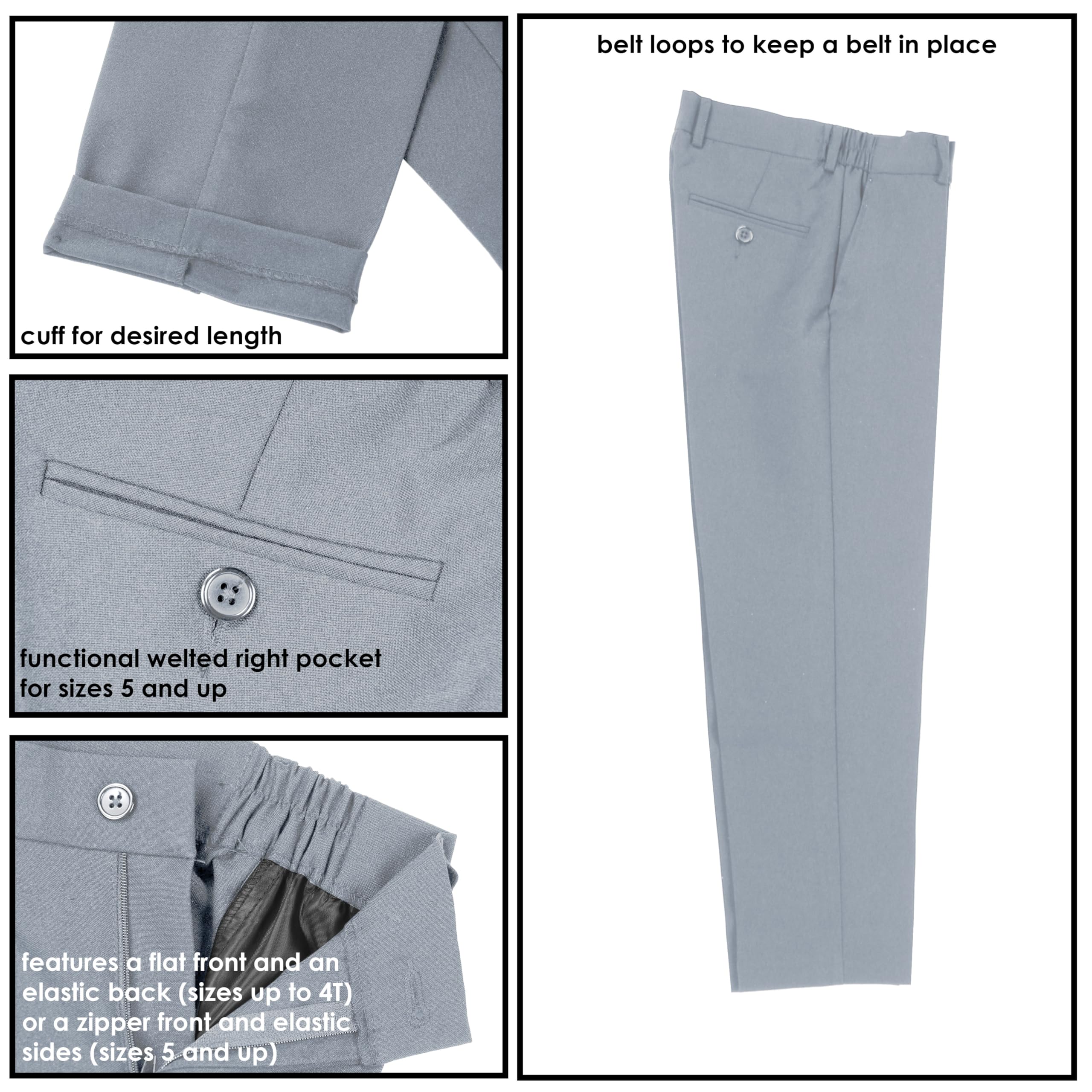 Vest is fully lined with light weight polyester back. For sizes up to 6, the necktie is a clip-on style, while for sizes 7 and above, it features an adjustable buckle closure for ease of wear. The pants feature a flat front design with an elastic back, offering both style and comfort for your little one.