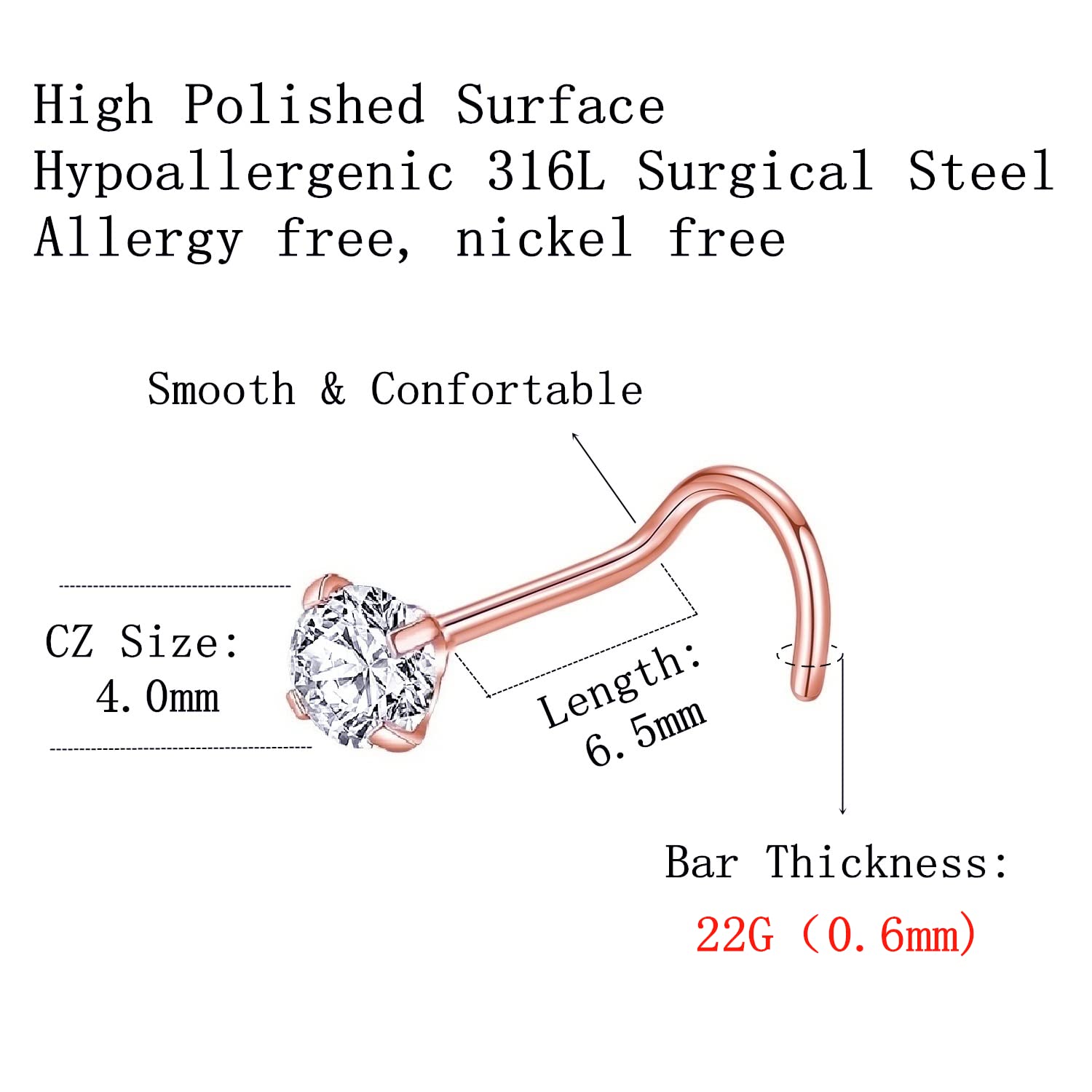 Quantity: 6pcs 4.0mm CZ screw nose rings. This screw nose ring size: Bar thickness: 22 gauge (0.6mm), Pin Length:6.5mm, Prong set cubic zirconia: 4.0mm, These stones a very bright and prong set by hand for accuracy.
