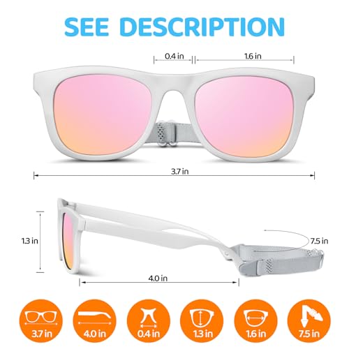 【Comfortable Fit for All Ages – Baby Essential】 These baby sunglasses feature a soft, adjustable strap and ultra-flexible frame to comfortably fit babies from 0-24 months. Lightweight, no slipping, no marks—perfect fit that grows with your child.
