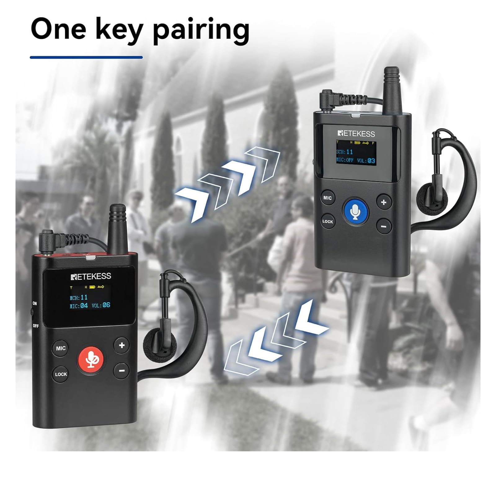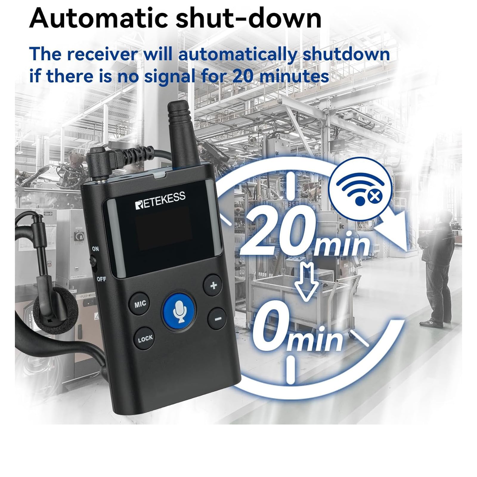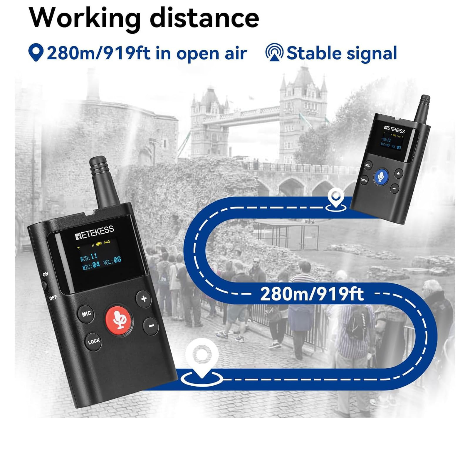 Retekess TT126 2 way communication system range of 280m/919ft; allowing participants to move freely within this range without losing connection; In factory environments; participants explore different areas of the factory; without missing any information or instructions