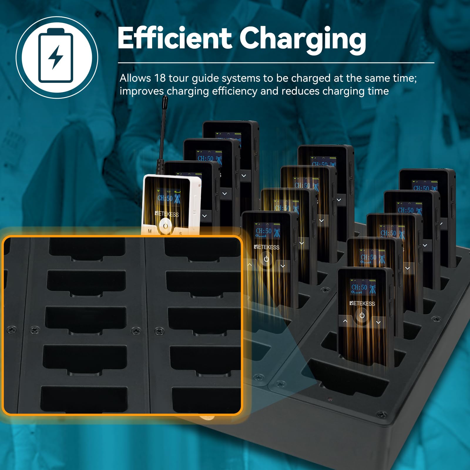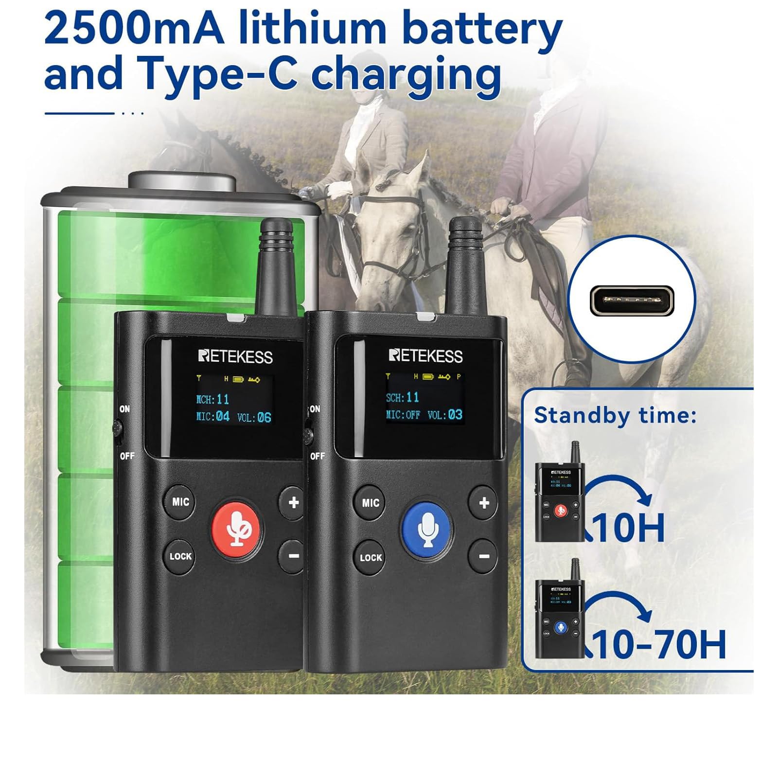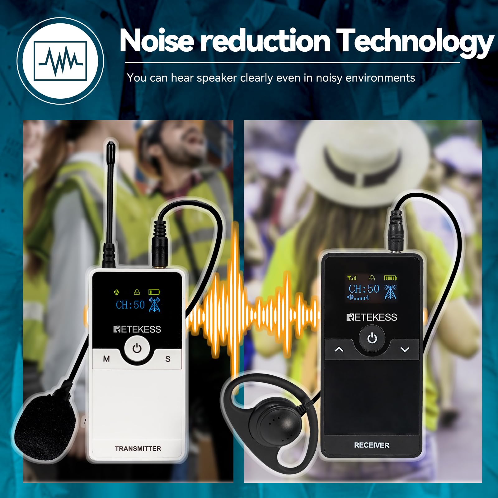 Retekess TT126 2 way communication system range of 280m/919ft; allowing participants to move freely within this range without losing connection; In factory environments; participants explore different areas of the factory; without missing any information or instructions