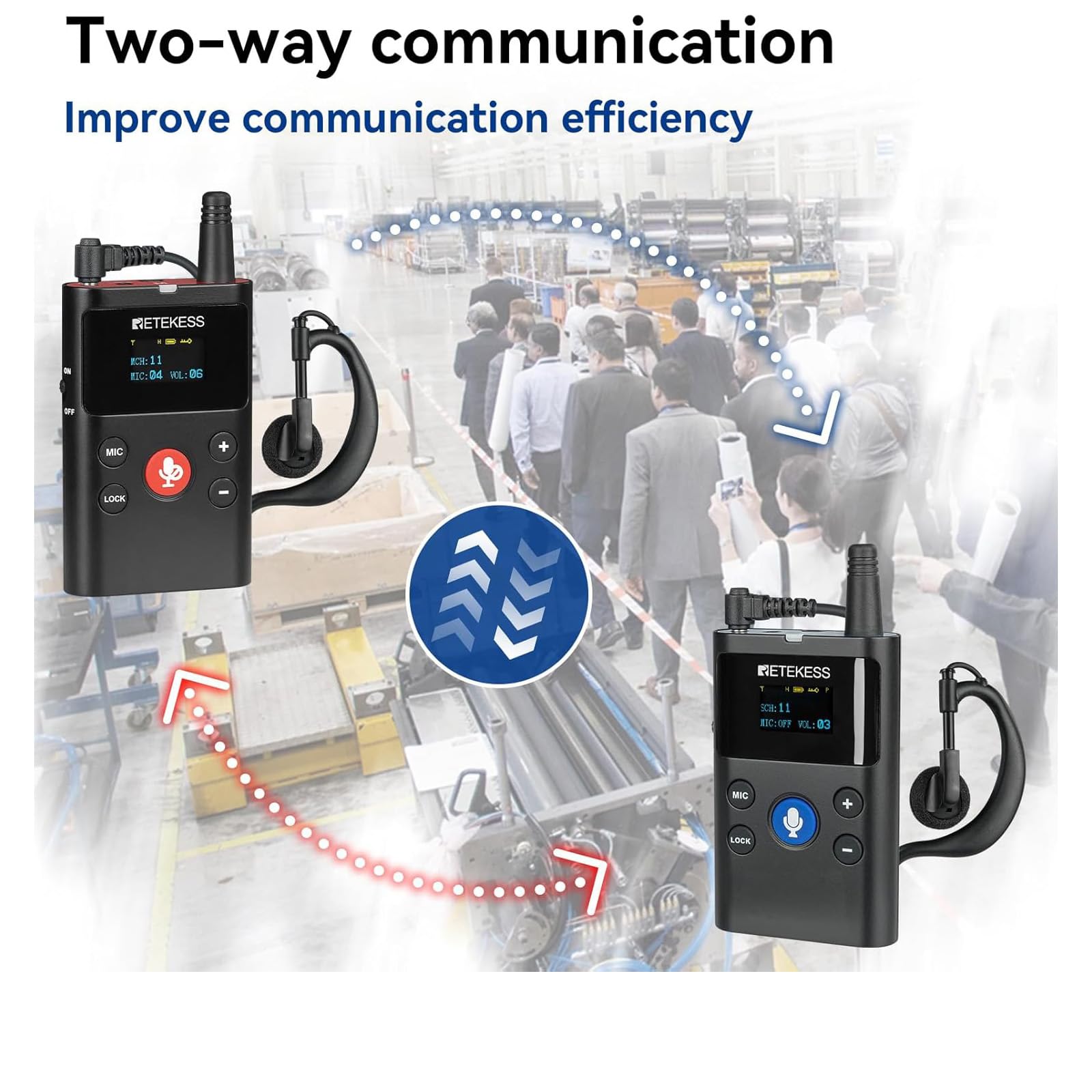 Retekess TT126 two way tour guide system supports two-way communication between the speaker and participants; real-time interactions enable participants to ask questions; promoting engagement and enhancing the overall factory visits experience
