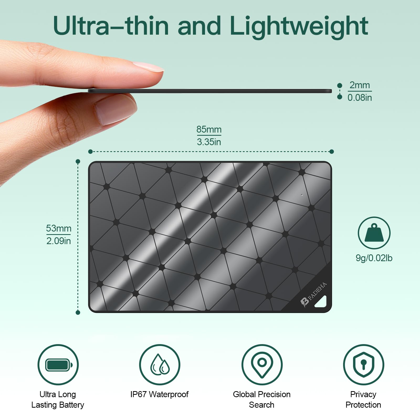 Slim, Durable & Wallet-Friendly Design - Apple MFI Certified ultra-thin card fits easily in any wallet without adding bulk or taking up extra space. This Smart Tag Tracking Device is built to last — IP67 waterproof, scratch-resistant. Includes full privacy protection and a worry-free replacement guarantee.