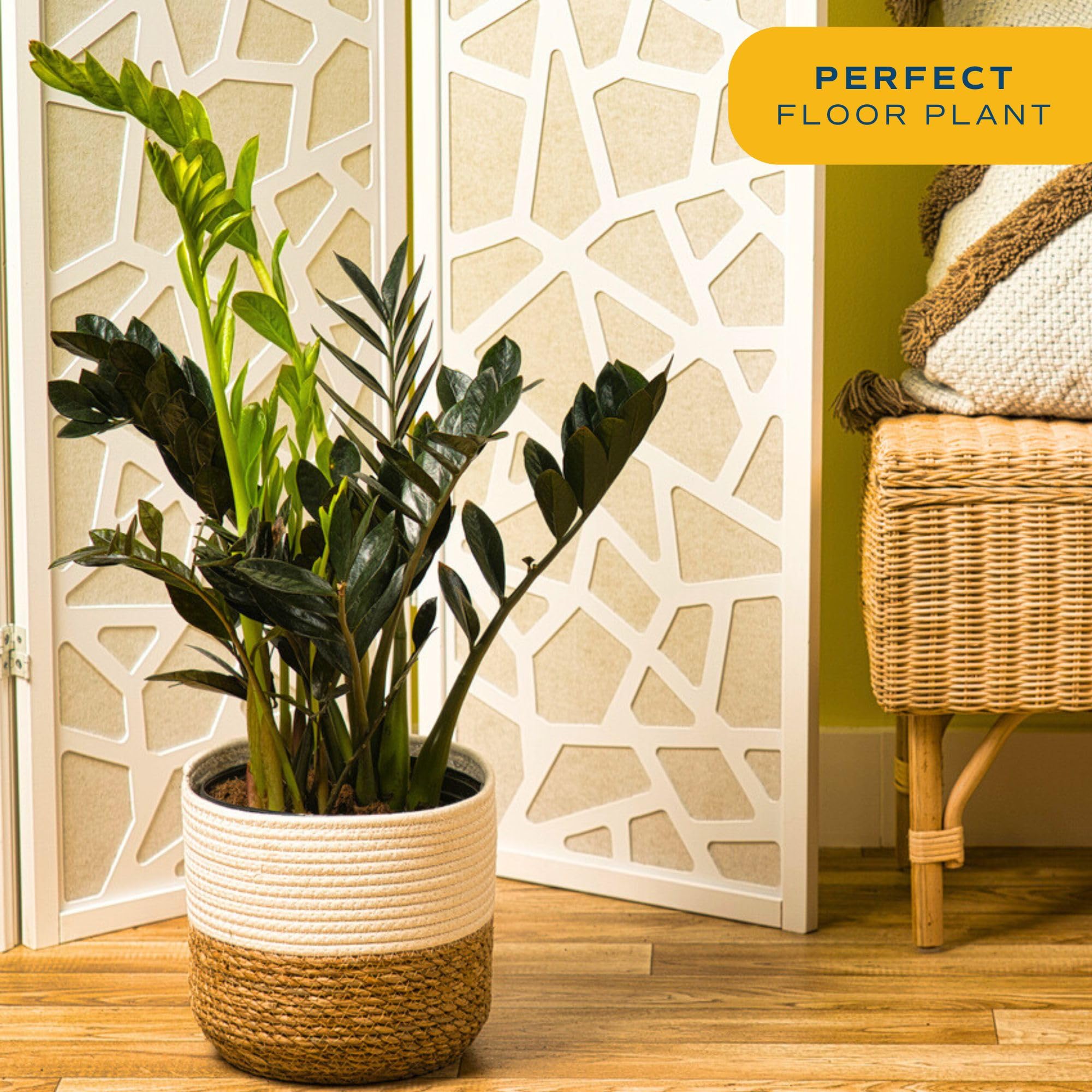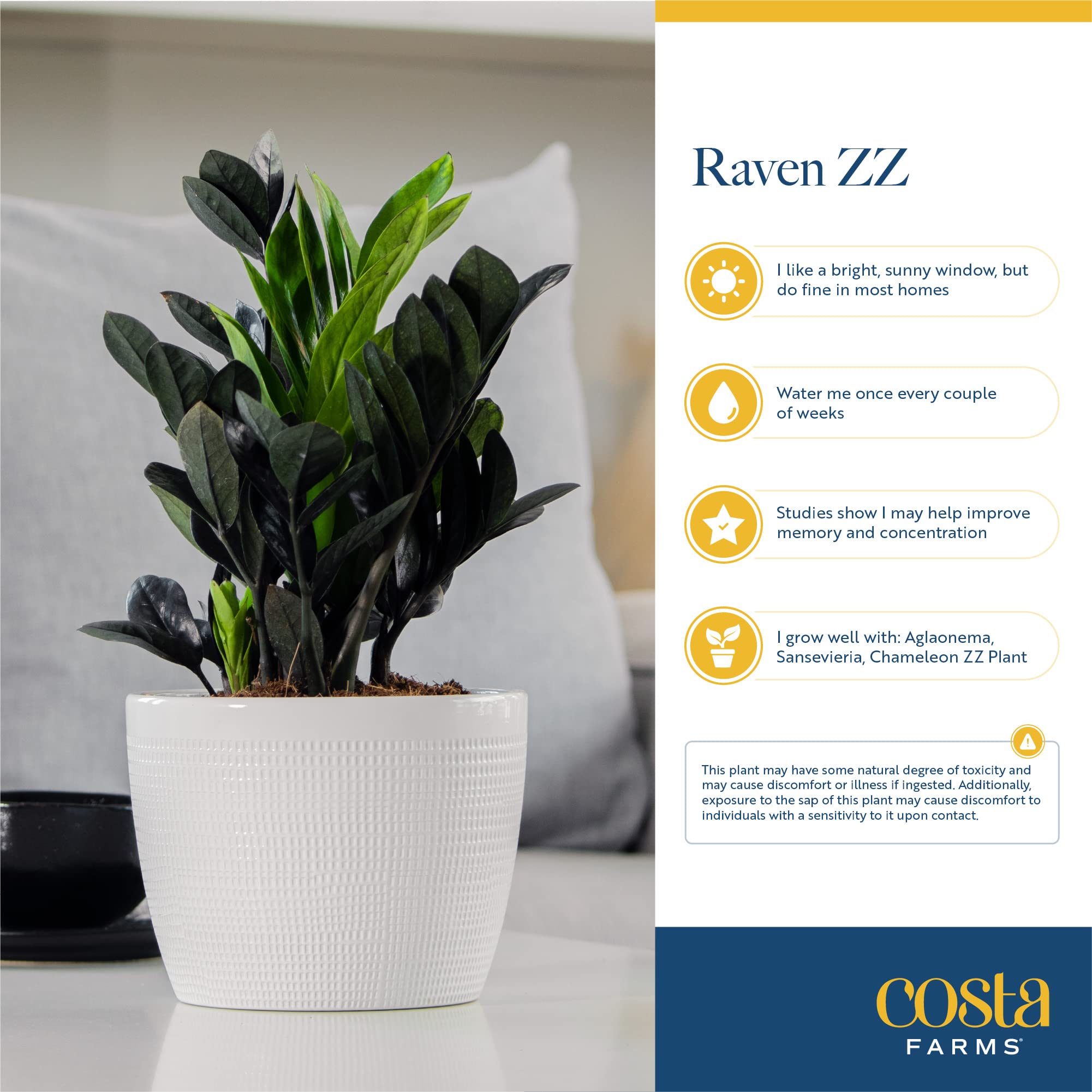 Raven® ZZ Zamioculcas ‘Dowon’ features solid, black foliage. The Raven® ZZ Zamioculcas ‘Dowon’ is great for large spaces. It does well in spaces that have medium, indirect light. Place Raven® ZZ Zamioculcas ‘Dowon’ in a spot that receives medium light (3-5 hours of sunlight). Water your plant about once every 2 weeks with approximately 2-3 cups and be sure all excess water drains away. Adjust as needed for your environment. Do not let the Raven® ZZ Zamioculcas ‘Dowon’ sit in water or overly soggy soil. The height at shipping is approximately 22-inches tall, measured from the bottom of the pot to the top of the plant. The Raven® ZZ Zamioculcas ‘Dowon’ ships in a white, 10-inch décor pot. To avoid water spillage, this container does not have holes. The Raven® ZZ Zamioculcas ‘Dowon’ is a slow grower. Exact growth rate depends on the care provided and its environment. Give it a boost during the warm months of Spring and Summer with a general-purpose fertilizer that is formulated for potted plants. Follow the instructions on the fertilizer package for the best use. When the plant out grows the current container, it is time to repot. To repot the Raven® ZZ Zamioculcas ‘Dowon’, gently remove it from its current container and place it into a slightly larger container. Fill in any empty spaces with new and fresh soil and water thoroughly. This plant is considered hardy in USDA Zone 9-11. Be aware of third-party sellers; other companies try to imitate our quality. There are no other authorized Costa Farms sellers. Look for ships from & sold by to ensure you’re getting our premium plants. Plants are living things; each one is slightly different, so the plant you receive may vary from the photo. Our growers hand-pick the healthiest and highest-quality plants. We package our plants for shipment with great care so they'll arrive at your home ready to be displayed. Shipped fresh from our farm to you, Costa Farms is passionate about delivering happy, healthy, beautiful plants. Costa Farms plants are not intended for human or animal consumption. Keep out of reach of children and pets.