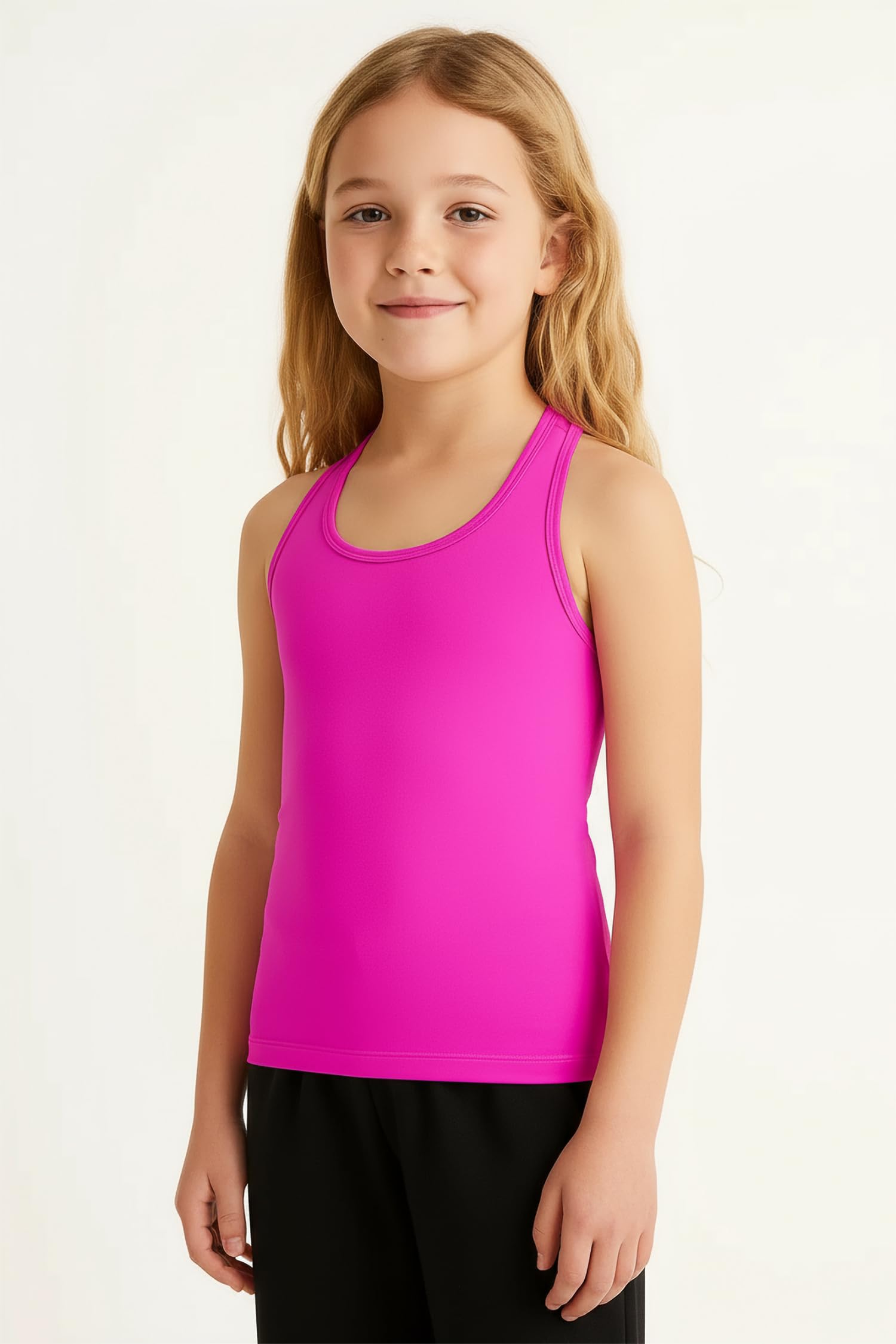 FASHION DESIGN - This affordable, high-quality racerback tank is a must-have fashion basic for stylish girls. With a classic crewneck, this versatile camisole can be paired with anything. The sleeveless design ensures that your kids’ arms won’t be restricted in any way. This slim fitting tank hugs your upper body and goes on your body like a second skin, which ensures that it doesn’t show when layered underneath other tops.