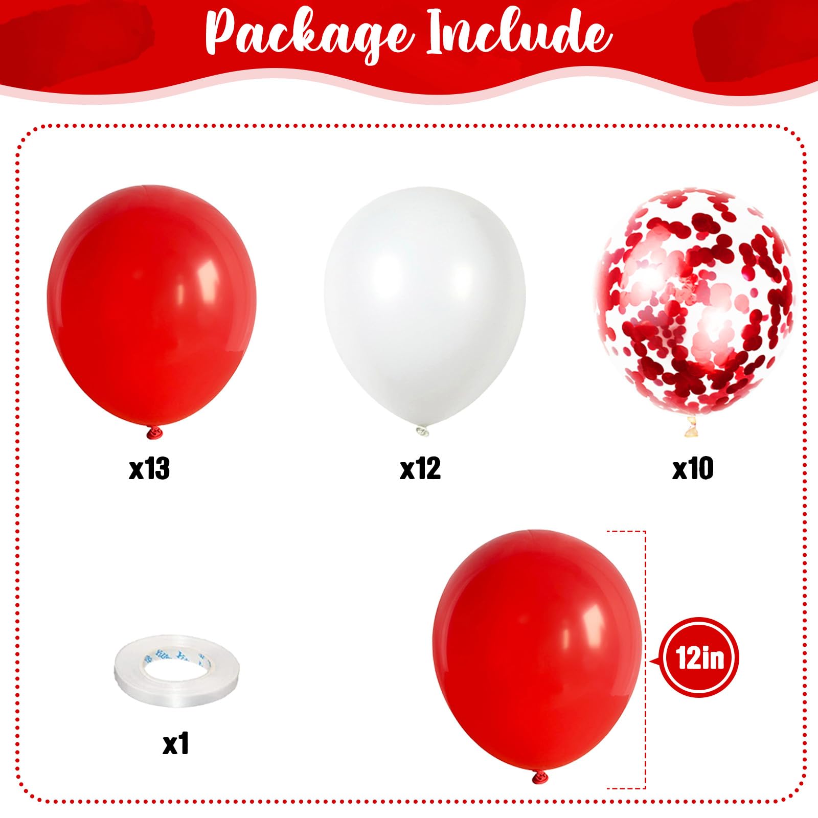 🎉 Premium & Durable Material - The red white confetti balloon kit is made of high quality 100% natural latex, thick thick and long-lasting, not easy to burst, every balloon has been rigorously tested and selected manually, safe for children. They can be filled with air or helium, suggested use with a balloon pump.