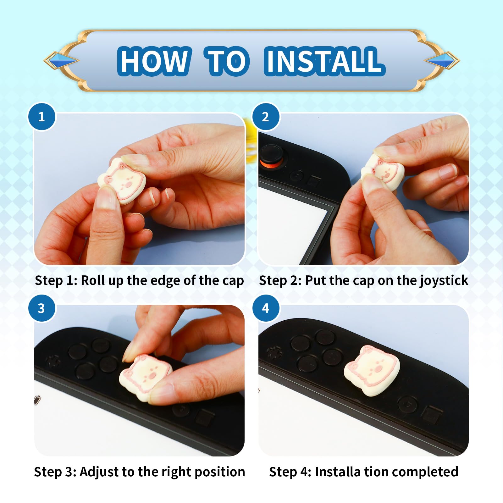 đăEasy to Install & Quality/Warrantyăâ Turn over the joystick caps. ⥠Align on the joystick. ⢠Fall the caps. Please note: Check if the caps wrap the joystick completely to prevent them from pop off when you playing. If you find any problems (damage, scratches, dirt, etc.), please feel free to contact us. Our shop always strives for customer satisfaction and always does our best to meet customer needs with better quality.