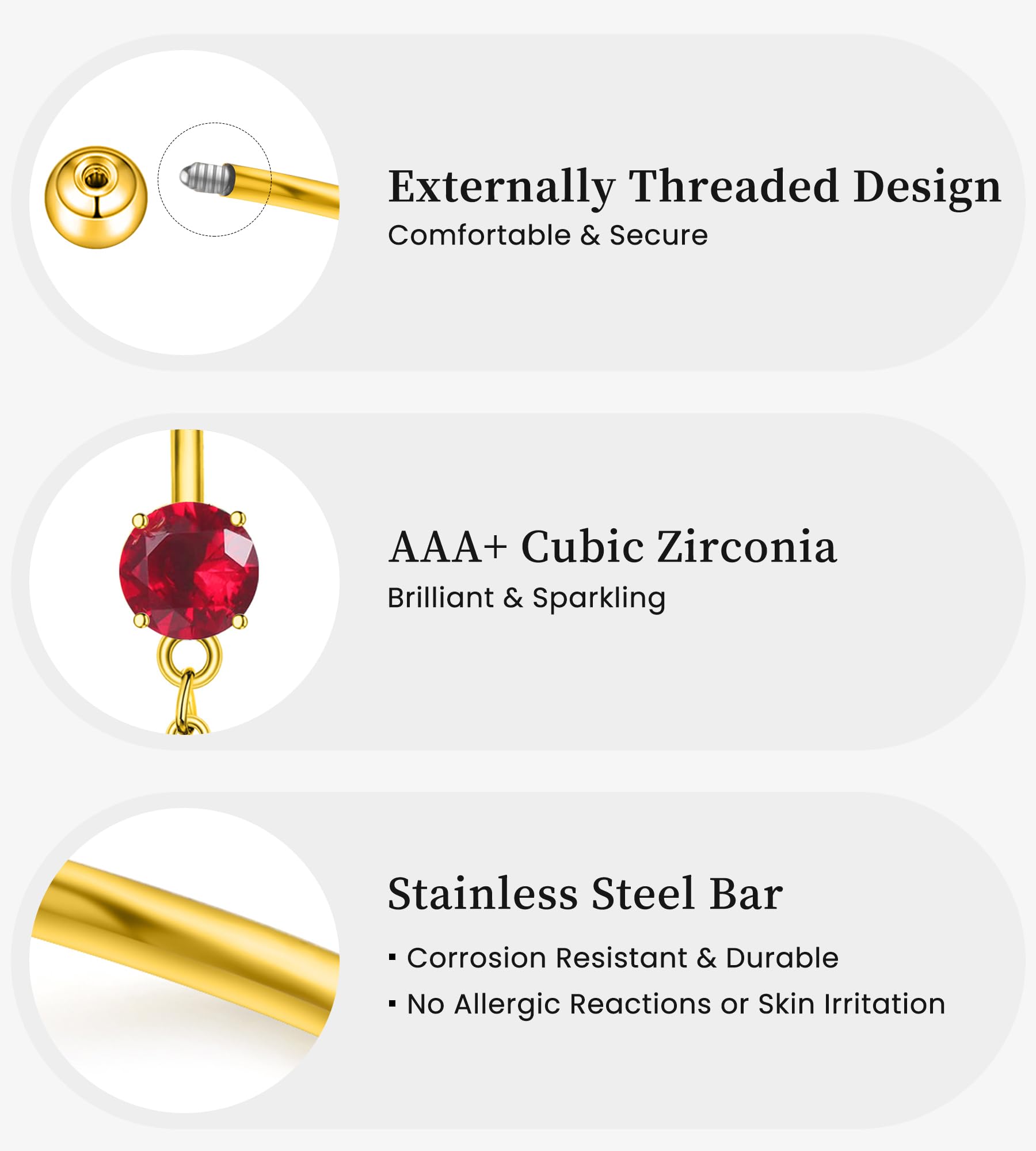 Belly Piercing Jewelry Gold Plated Material: Belly bars are made of stainless steel, lead & nickel free, healthy for sensitive belly button