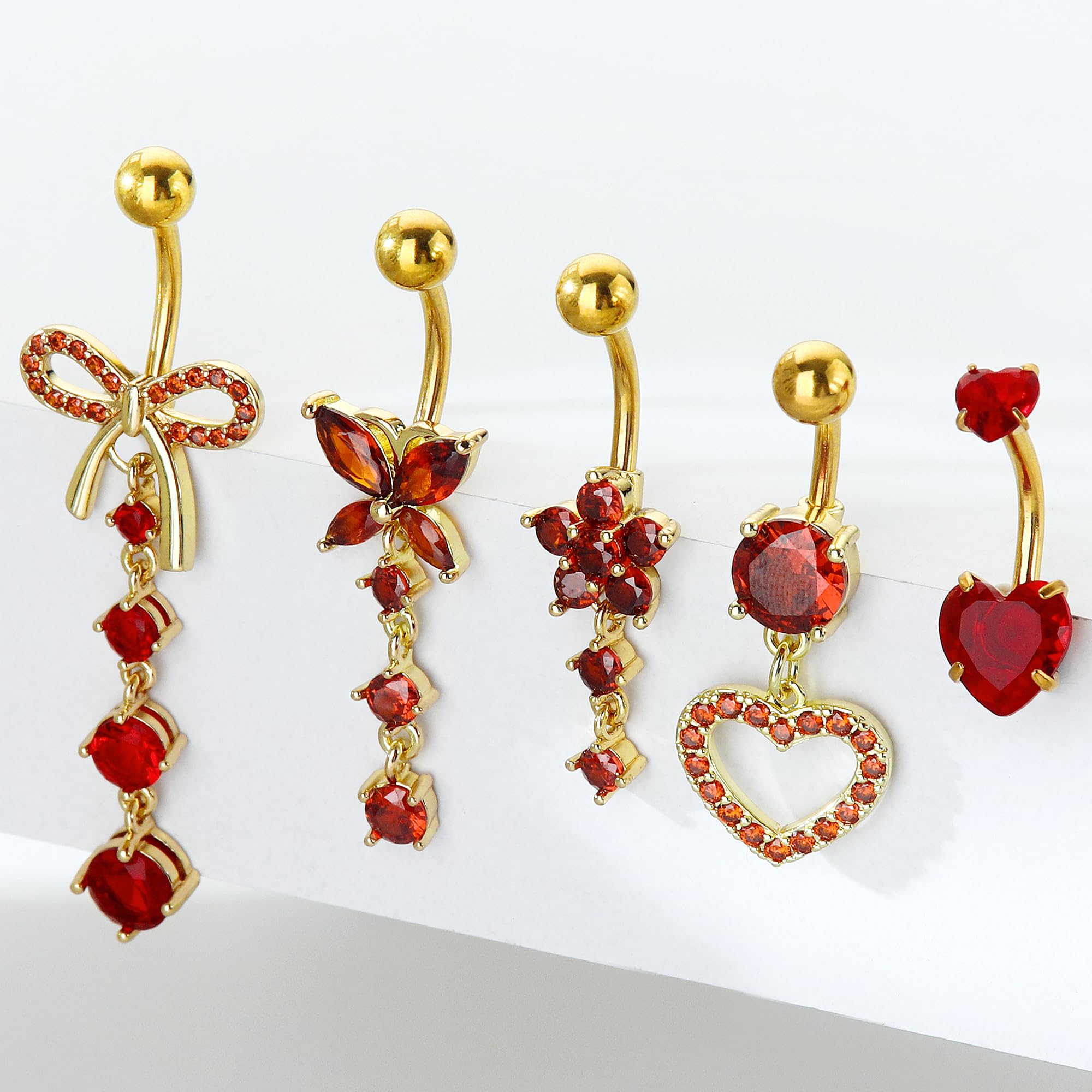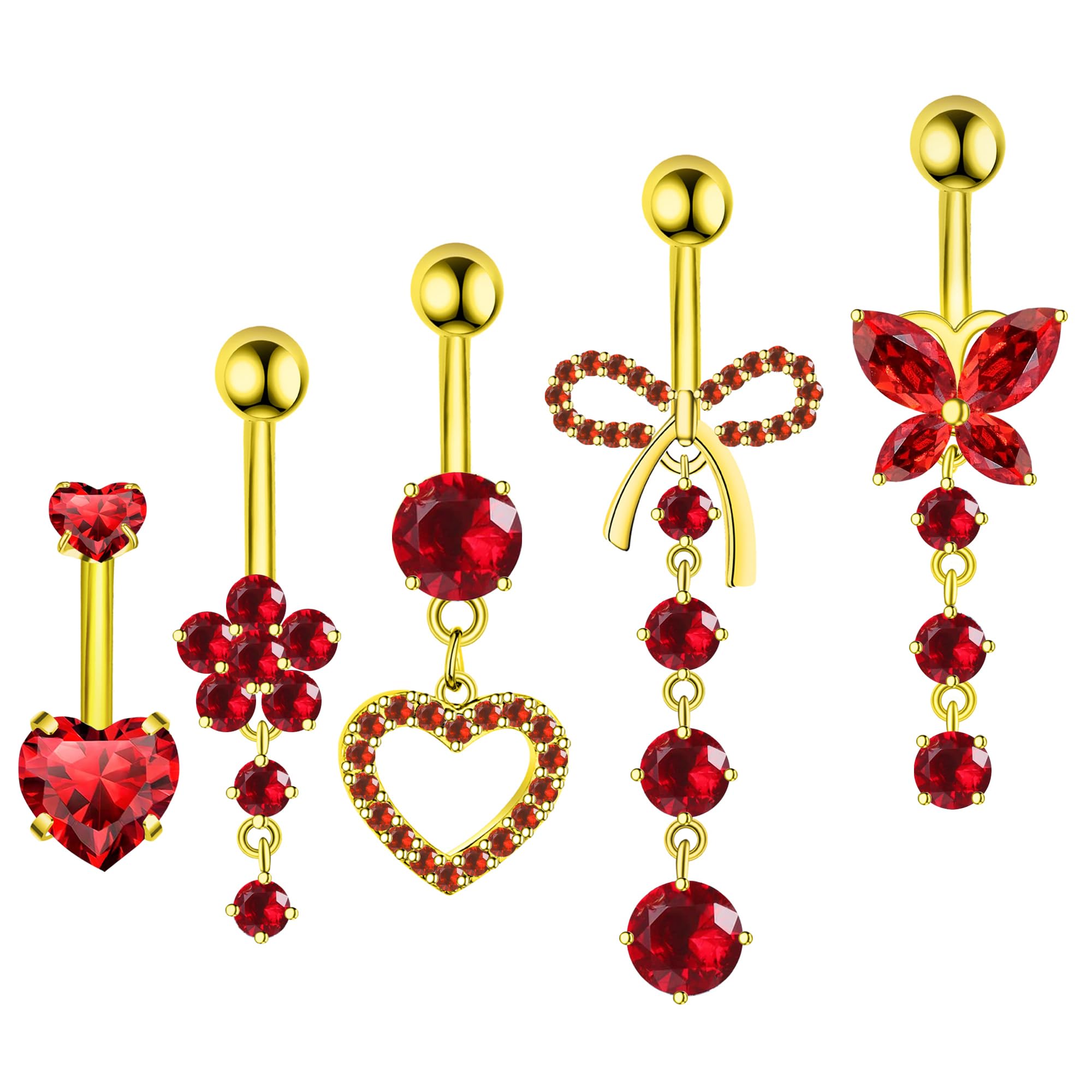 Belly Button Ring Set: 1 belly button ring pack includes 5 pieces belly button rings gold plated, 1 piece internally threaded double heart red cubic zirconia belly ring gold plated, 1 piece red cz flower gold plated belly button ring dangle, 1 piece red cz paved heart dangle belly button ring gold plated, 1 piece red cz bow belly button ring gold plated dangle and 1 piece cz butterfly belly button ring dangle gold plated, so many cute gold plated dangle belly button rings for women to choose from and match for your outfit