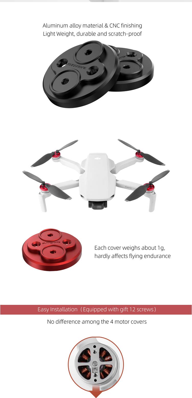 Work for DJI Mini 4K/Mini 2 SE/Mini SE/Mini 2/Mavic Mini drone; Material: Lightweight aluminum alloy, CNC processing technology, weight: 4g/set; Equipped with a set of motor covers, lengthen motor lifespan - Effectively prevent dust, splashed water, getting wet raining days and scratched during transportation; Equipped with a set of motor covers, lengthen motor lifespan - Effectively prevent dust, splashed water, getting wet raining days and scratched during transportation; Packing list: 1 Set Motor Caps