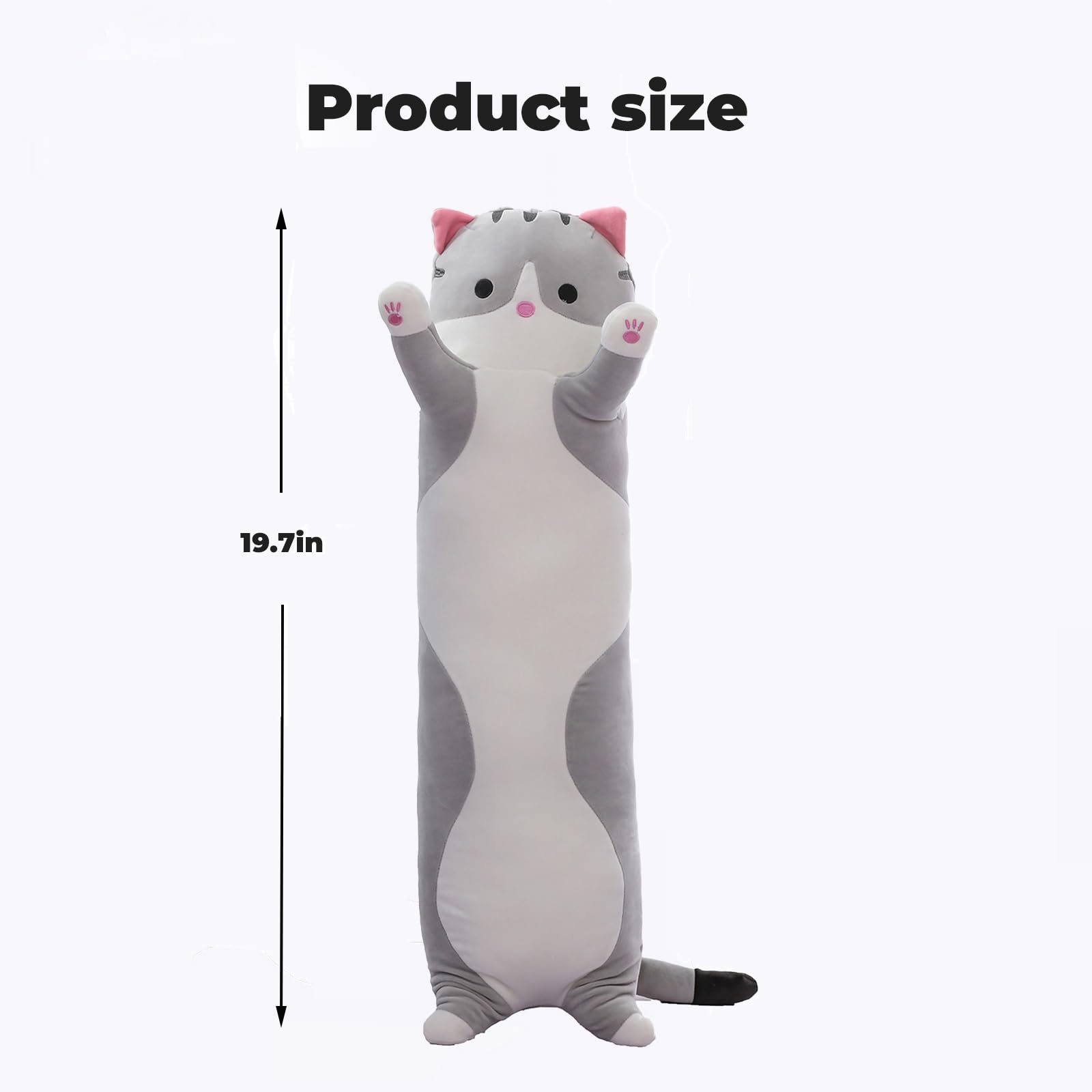 Cat Plushy Size: The cat pillow length is about 19.7". Note: Measure from nose to hip when fully recovered. Made with child-safe materials, ensuring a safe and soft cuddle for kids