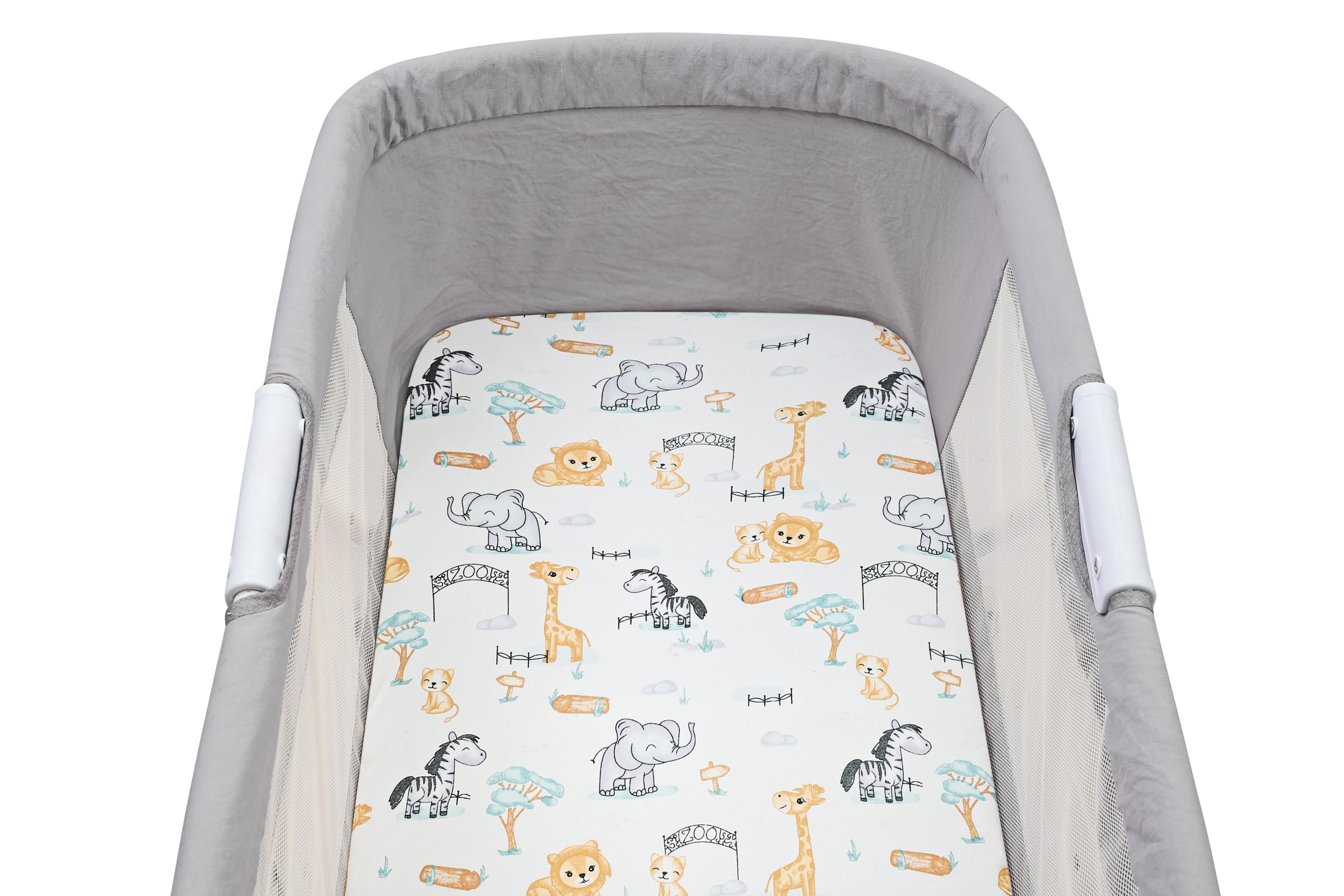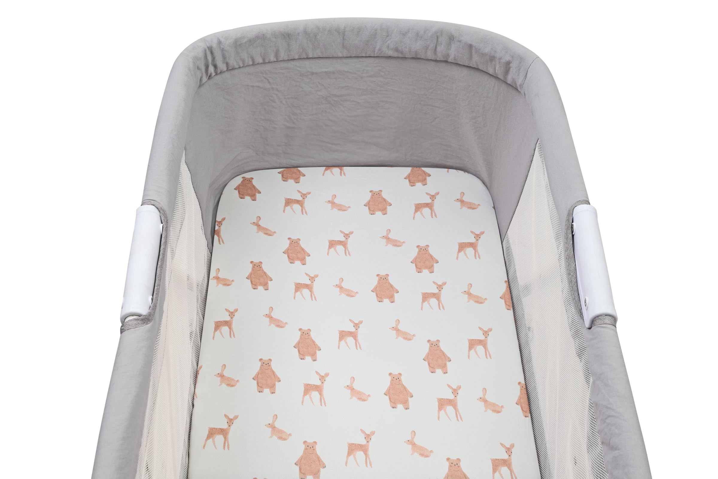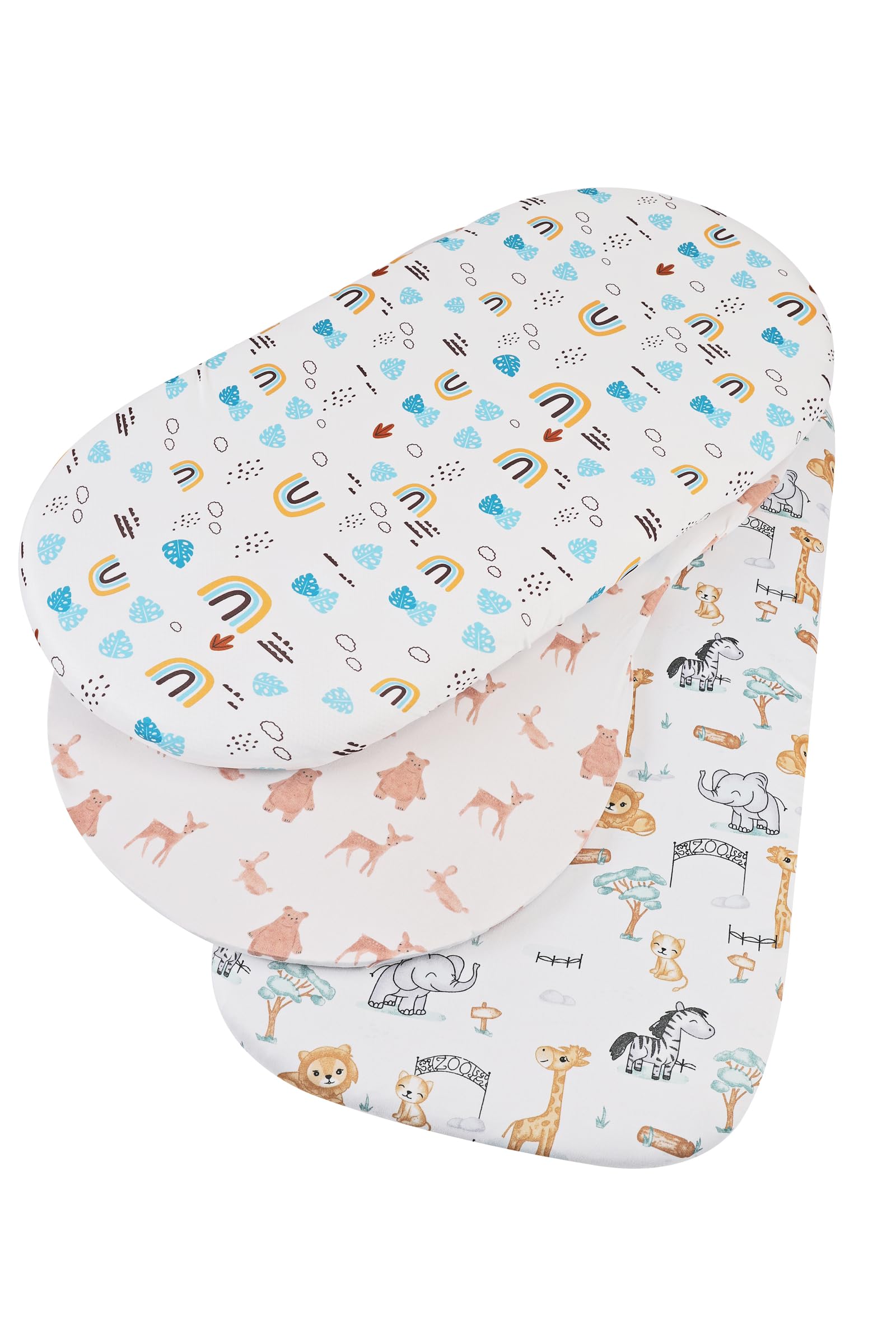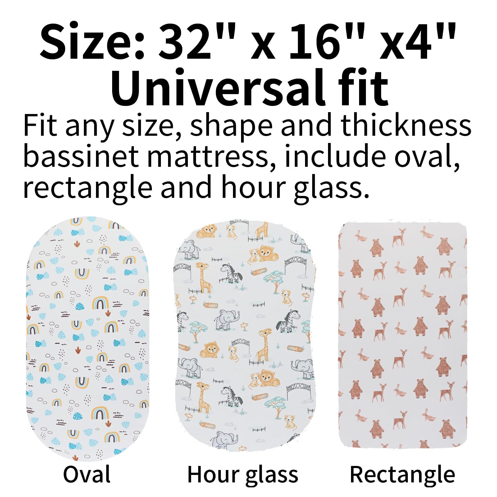 Cute Animal Bassinet Fitted Sheet Set 3 Pack for Baby Boy and Girl UNIVERSAL SIZE Each sheet measures 16"x32"x4", this size allows you to fit our sheets on almost rectangle, hour glass and oval bassinet mattresses. Example: 31 x 15 x 1 inch oval bassinet mattresses; 29.5 x 18 x 1 inch hourglass bassinet mattresses; 32 x 16 x 2 inch rectangle bassinet mattresses and 29 x 14 x 2 inch rectangle bassinet mattresses. 360Β°ELASTIC BAND Elastic band is sewn along sheet for covering bassinet mattress/ pad snugly and firmly, say goodbye to those sheets which are ill-fitting or bunched up because too loose or too tight. ADORABLE DESIGNS 3 pack set, one printed with rainbow leave and cloud, one printed with elephant tiger lion and giraffe, and another one printed with brown deer bear and rabbit, our bassinet sheets match any style baby boy's and girl's room decoration. SOFT, SKIN-FRIENDLY FABRIC Our bassinet sheets are made of premium quality knitted fabric, hypoallergenic and beathable, gentle to touch, safe for baby delicate skin. It will help your little one sleep comfortably and peacefully! GREAT VALUE Our 3 pack sheets allows you to always have a clean sheet on hand. CARE TIPS: Warm gentle machine wash separately before use Don't bleach Tumble dry on low heat