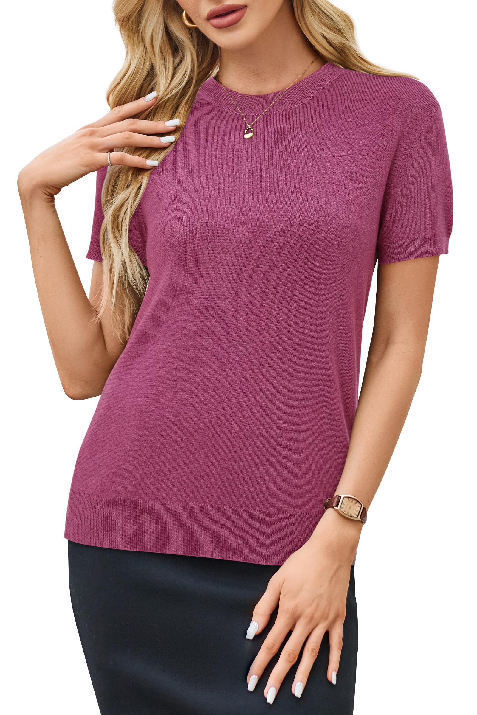 Features: Women's Summer Tops/ Essential Pullover Sweater/ Classic/ Loose Fit/ Short Sleeve/ Crew Neck/ Elastic Hem/ Solid Color