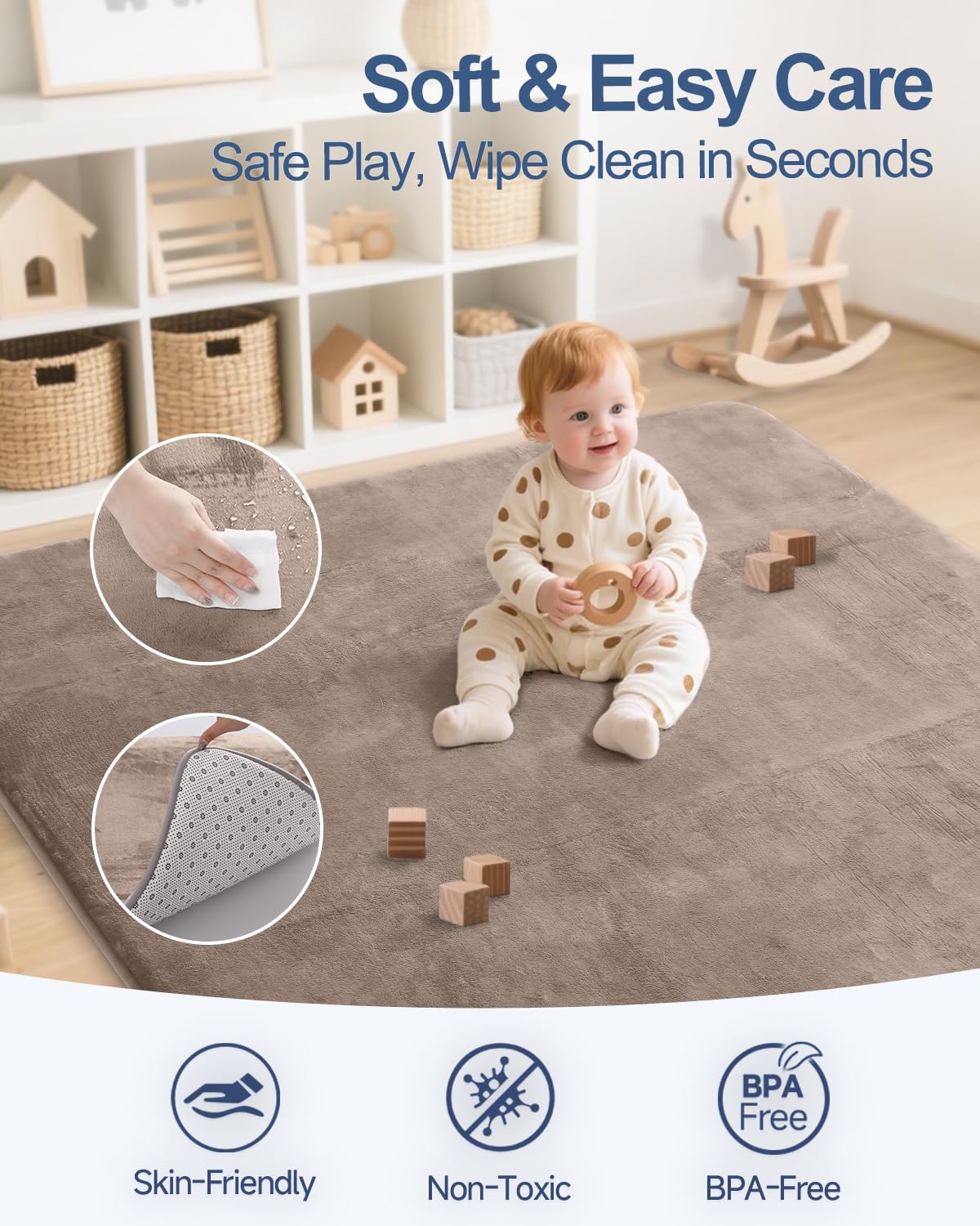 Thickened Foam Play Mat: Our premium foam mat is made of 1.2 inches thickened memory foam.It's sturdy enough to support two adults without ground feeling. The surface is made of ultra-soft flannel fabric, luxurious and comfortable for babies and family time.It does not fade.It provides a soft and safe play space, making it an ideal play mat for babies 6-12 months, encouraging them to explore endless fun with confidence.