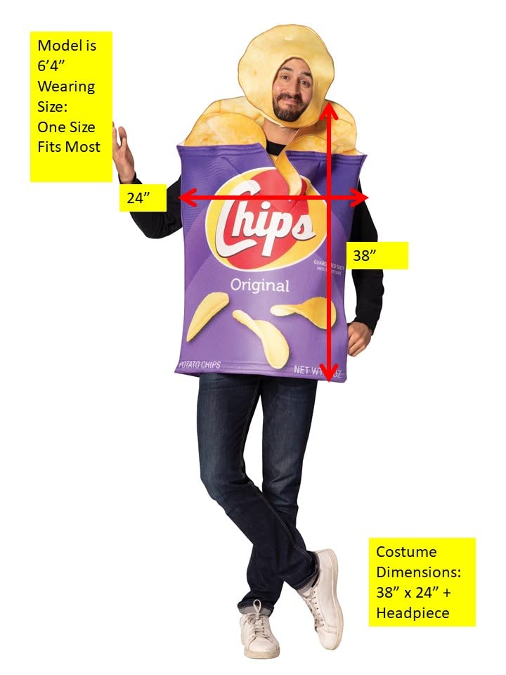 DIMENSIONS: The approximate product measurements for the Potato Chips Bag Costume are 38" x 24" (L x W) + head piece.