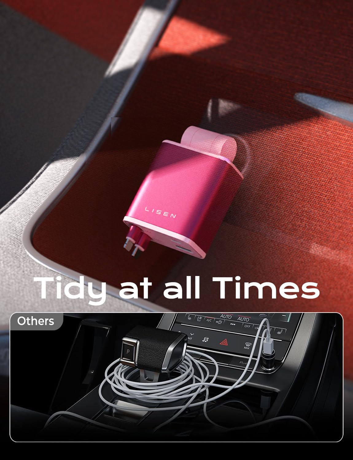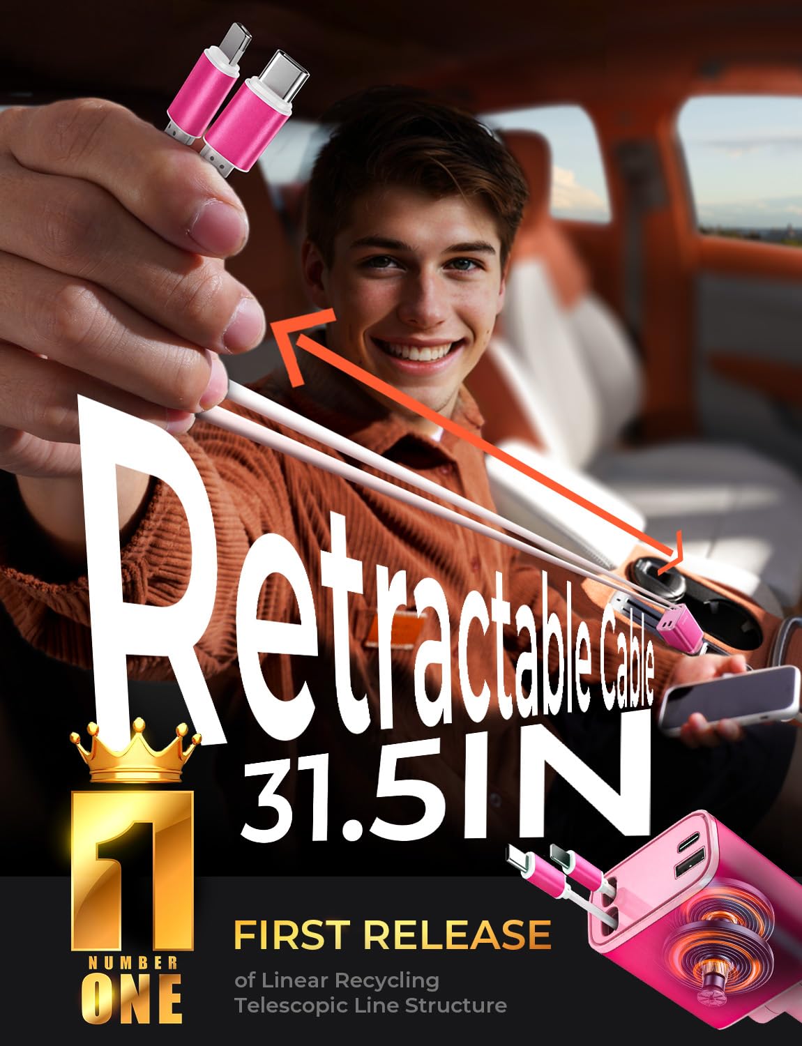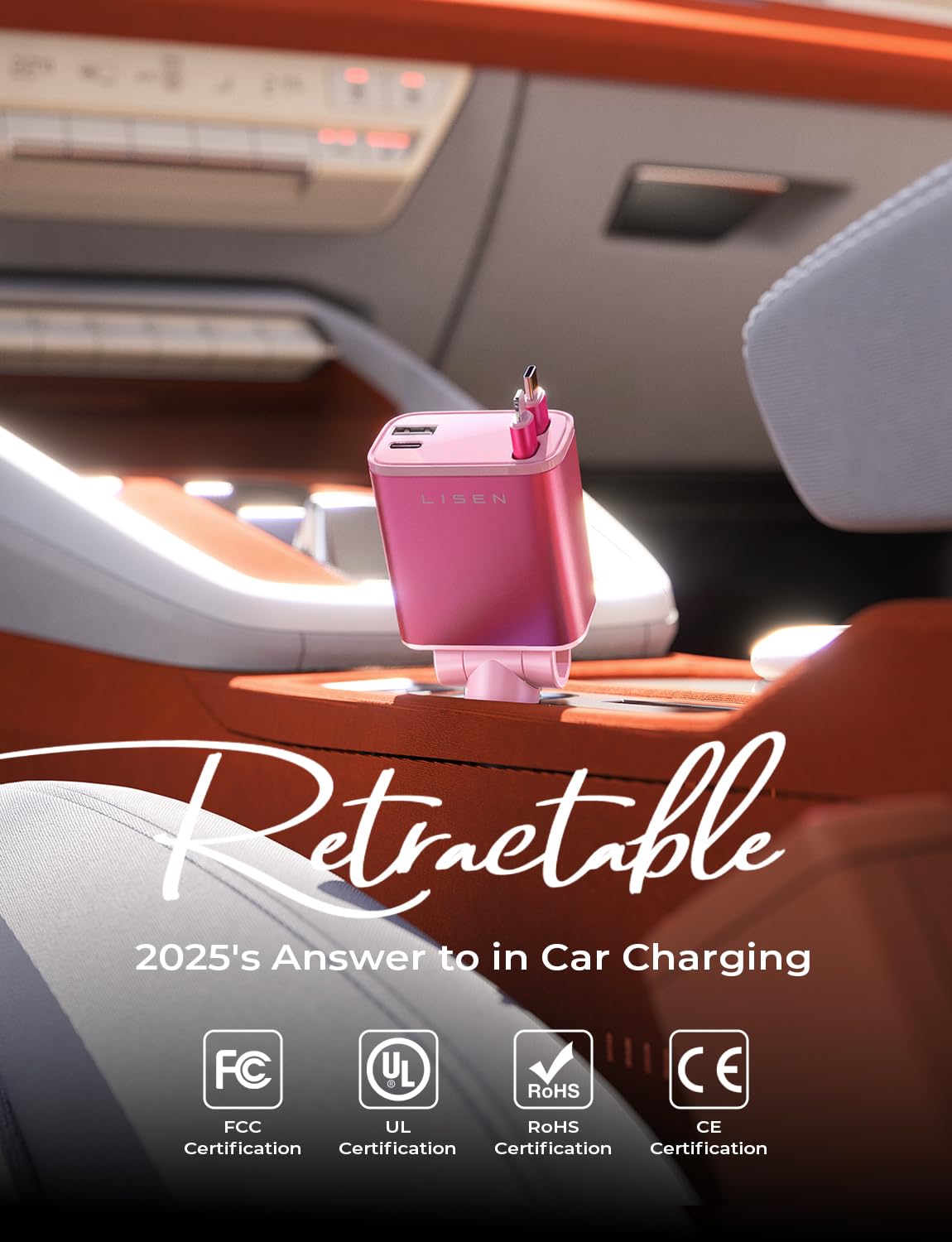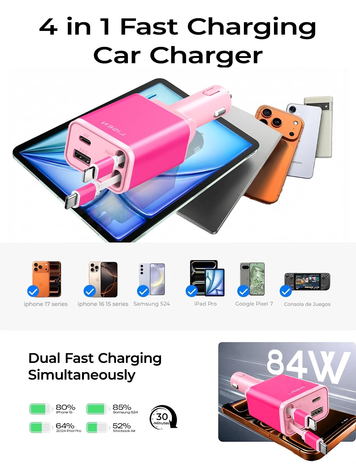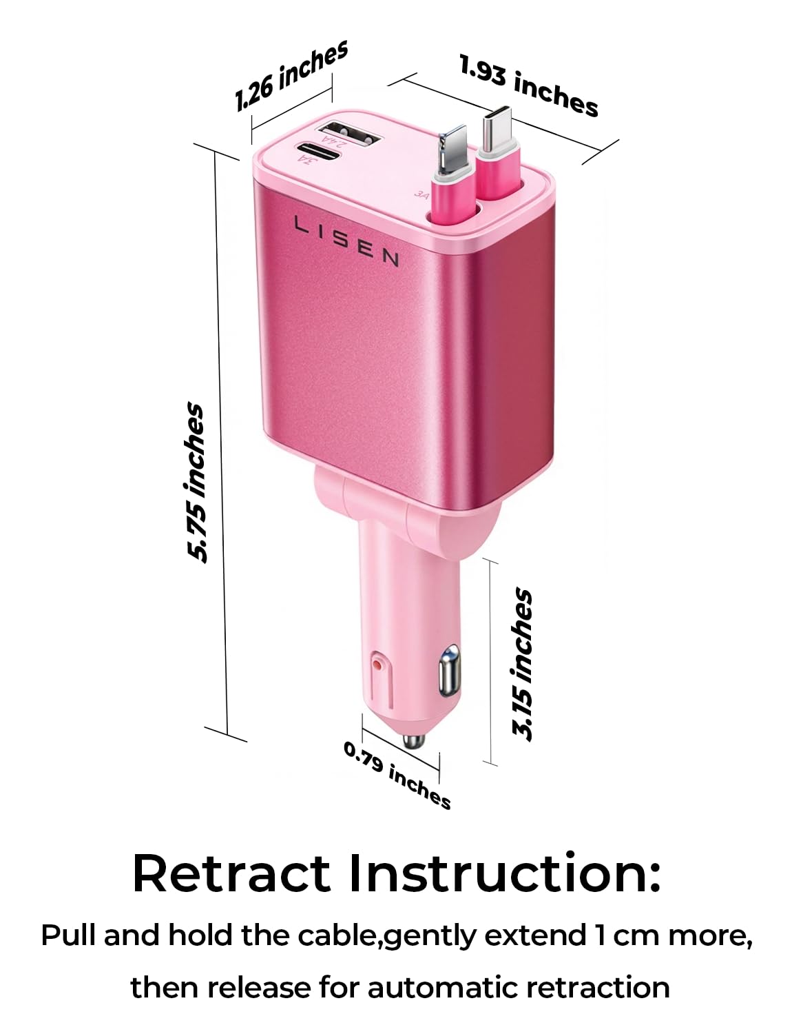 [All-NEW Retractable Car Charger] The 4 in 1 retractable car charger pulls out the cable within the 80 cm range, Compatible with iPhone car charger includes 2 retractable cable, and it retracts back inside automatically for storage, keeping it clean and tidy without cable entanglement, and car organization facilitating convenient control and usage.Compatible with iphone 17 car charger and galaxy S25 and other smartphones.