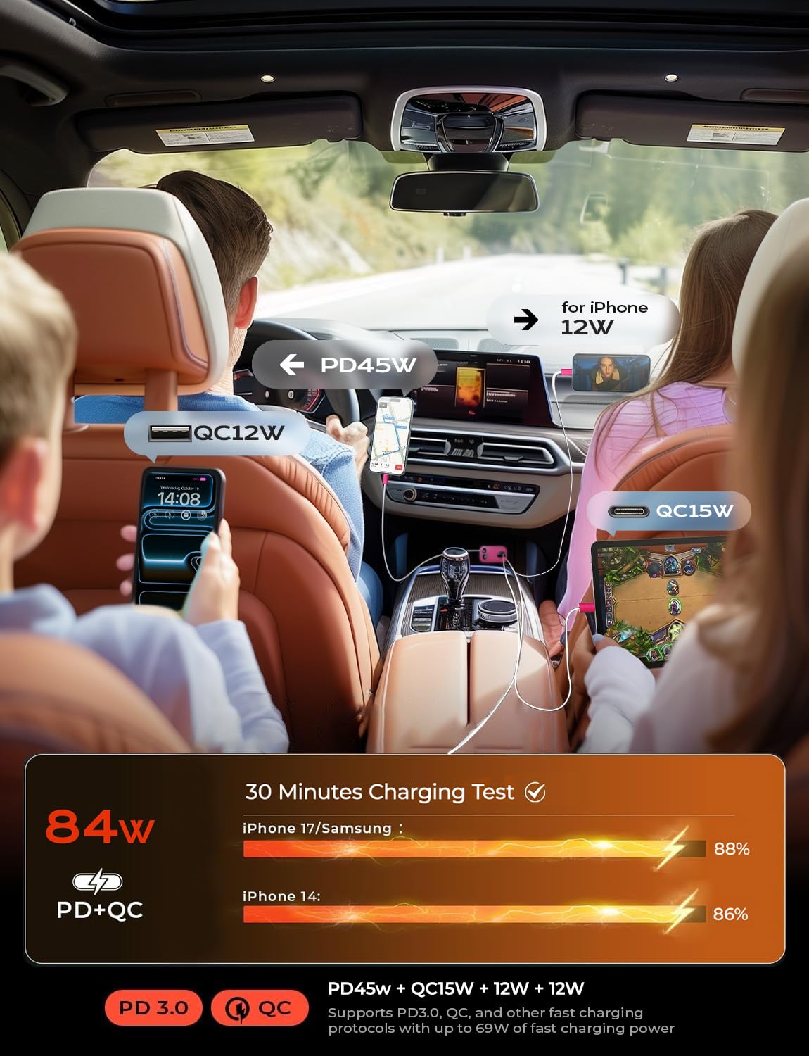 [Multi-Fast Charging Protocol Certification] The car usb c charger fast charge compatible with devices supporting PD, QC3.0, AFC, MTK, and FCP including phones, tablets, Switch, etc.The Car charger for iPhone 17/17 Pro Max/17 Pro/17 Air/16/15/14/13/12/11/XS/XR/X/8 Plus/8/7 Plus/7/6S/6, compatible with Galaxy S25/S25 +/S24/ S23/ S22/S22+/S22 Ultra/S21+/Note 20 Ultra/S20/S10 5G /A54/S9 Plus etc. compatible with Pixel 10/9/pro/Pro XL/Pro Fold/8/8a 7/ 7a/6/6a/5/ 4xl/ 3xl/ 3a/4/4a/Nexus 6P etc.