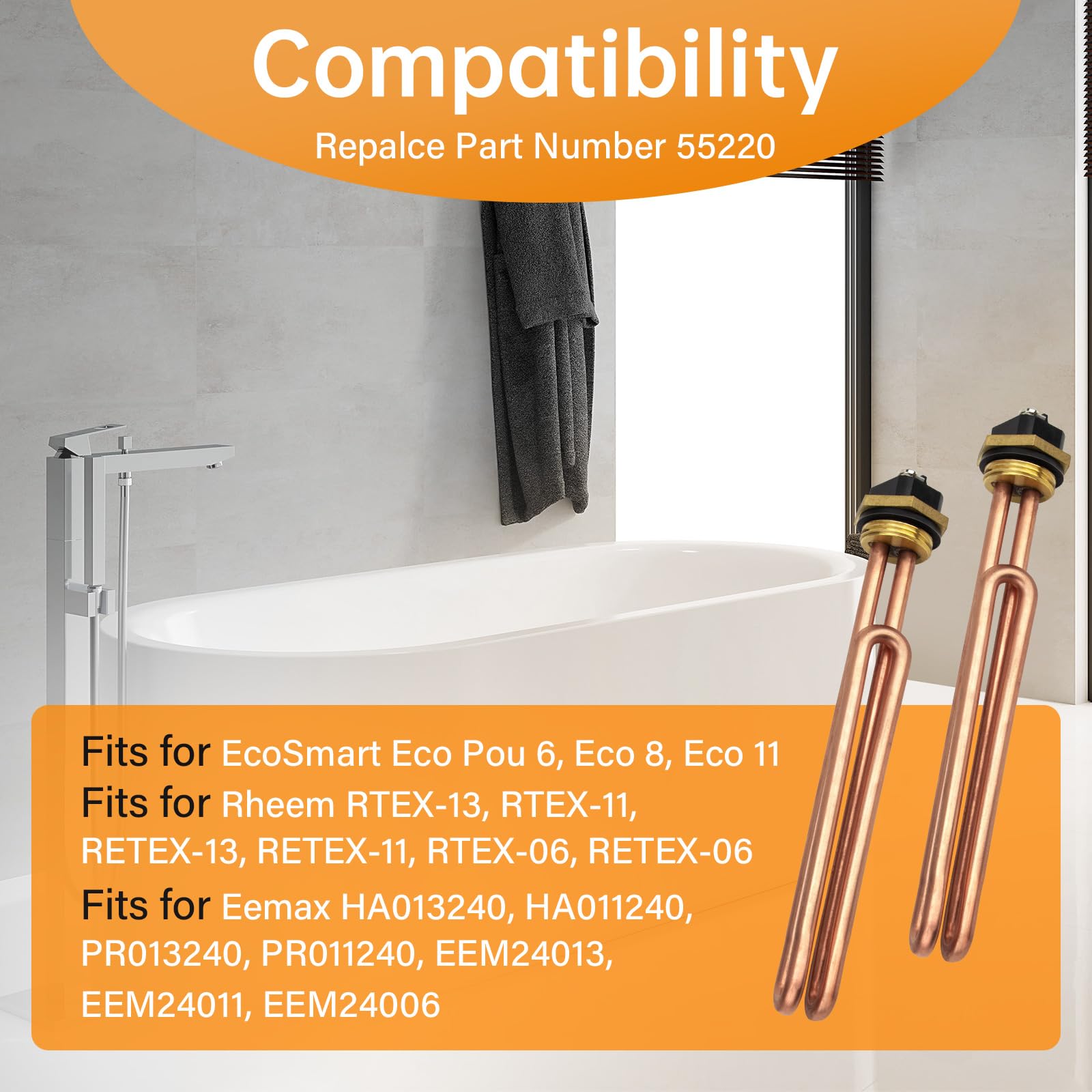 【Compatibility】HE 55220 water heater element fits for EcoSmart Eco Pou 6, Eco 8 & Eco 11; Fits for Eemax HA013240, HA011240, PR013240, PR011240, EEM24013, EEM24011, EEM24006; Also fits for Rheem RTEX-13, RTEX-11, RETEX-13, RETEX-11, RTEX-06, RETEX-06, Richmond RMTEX-06 electric tankless water heater.