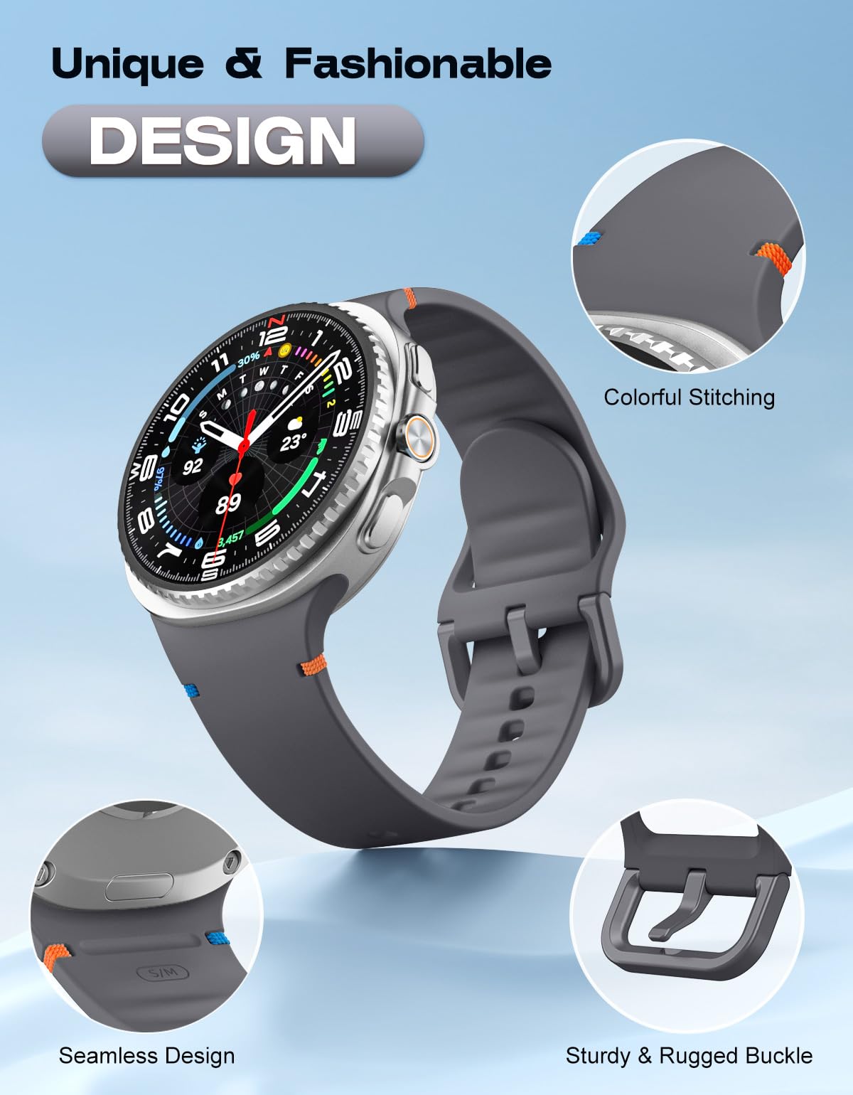 Seamless Design: The Galaxy Watch 8 band is accented with colorful stitching, adding a touch of elegance to your wrist, and the rippled design inside the band allows for easy drainage and quick drying of sweat. It has a lugless design that blends seamlessly into the body of the watch, ensuring a sleek look and comfortable fit, especially during intense exercise.