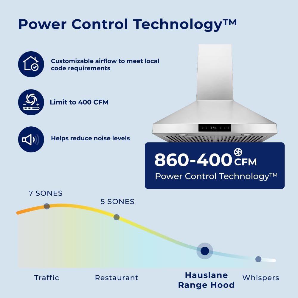 SAVE TIME AND MONEY: Our Power Control Technology allows you to limit the suction power to a max of 400 CFM – no make-up air system required, making it an excellent wall mount range hood option. Save money on labor and material costs.