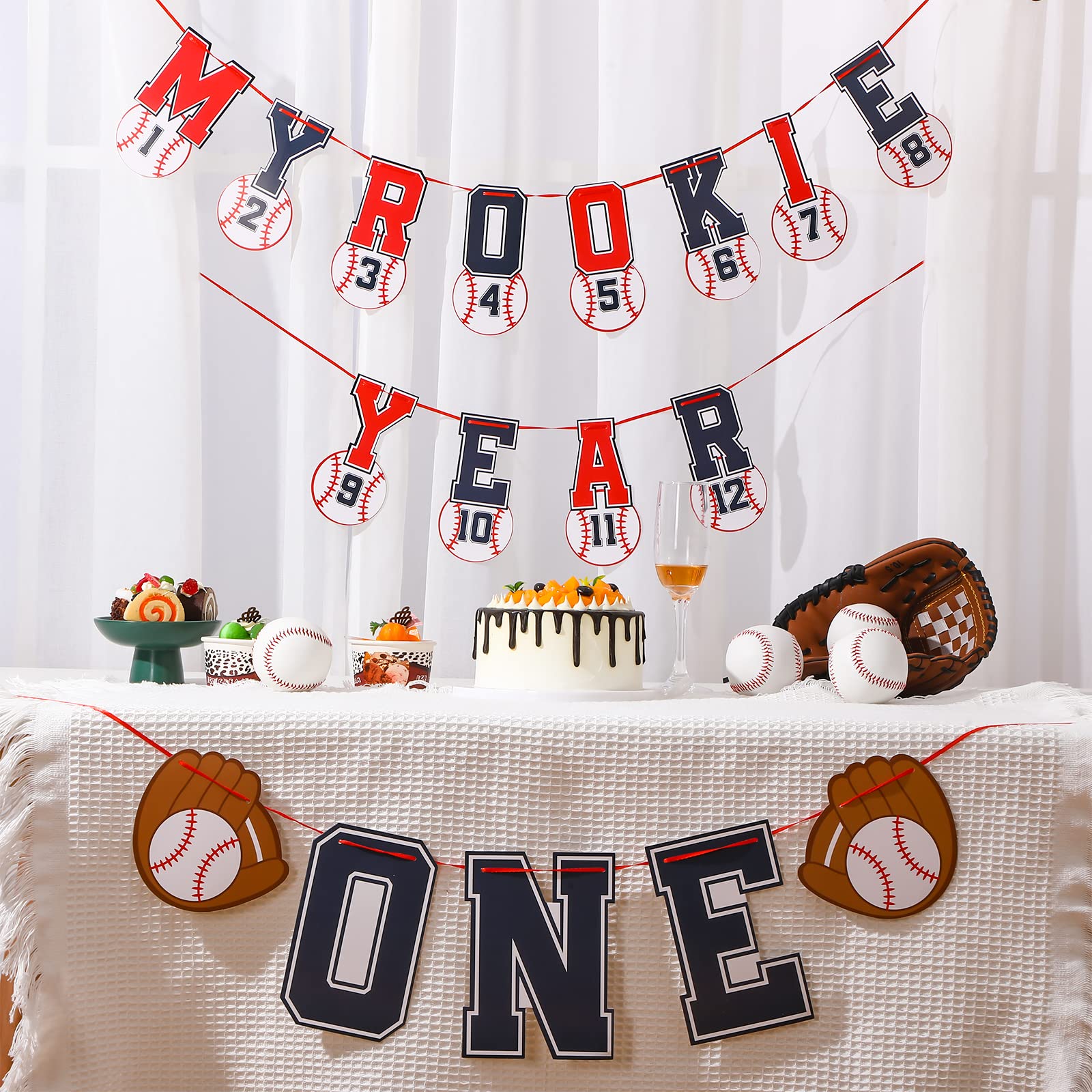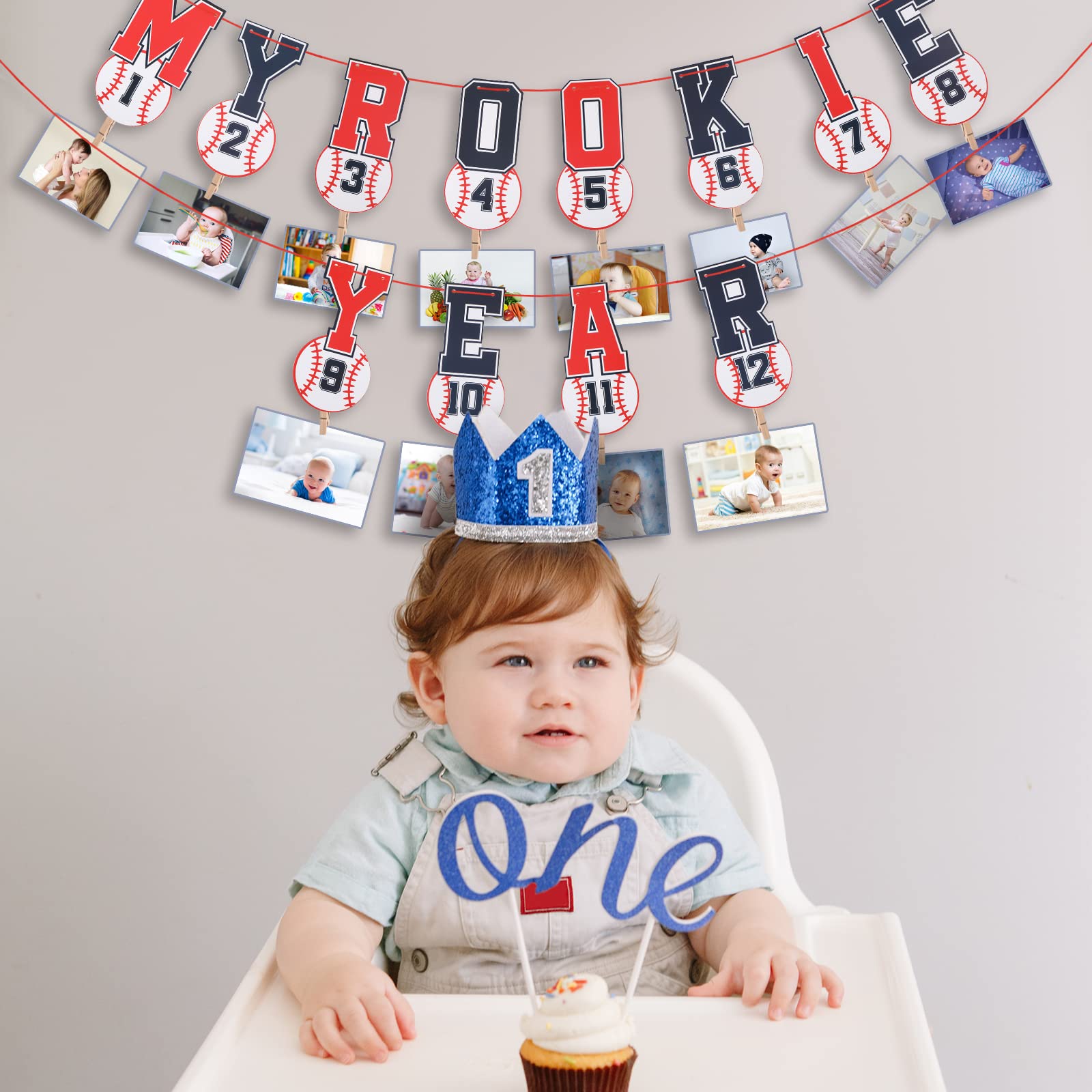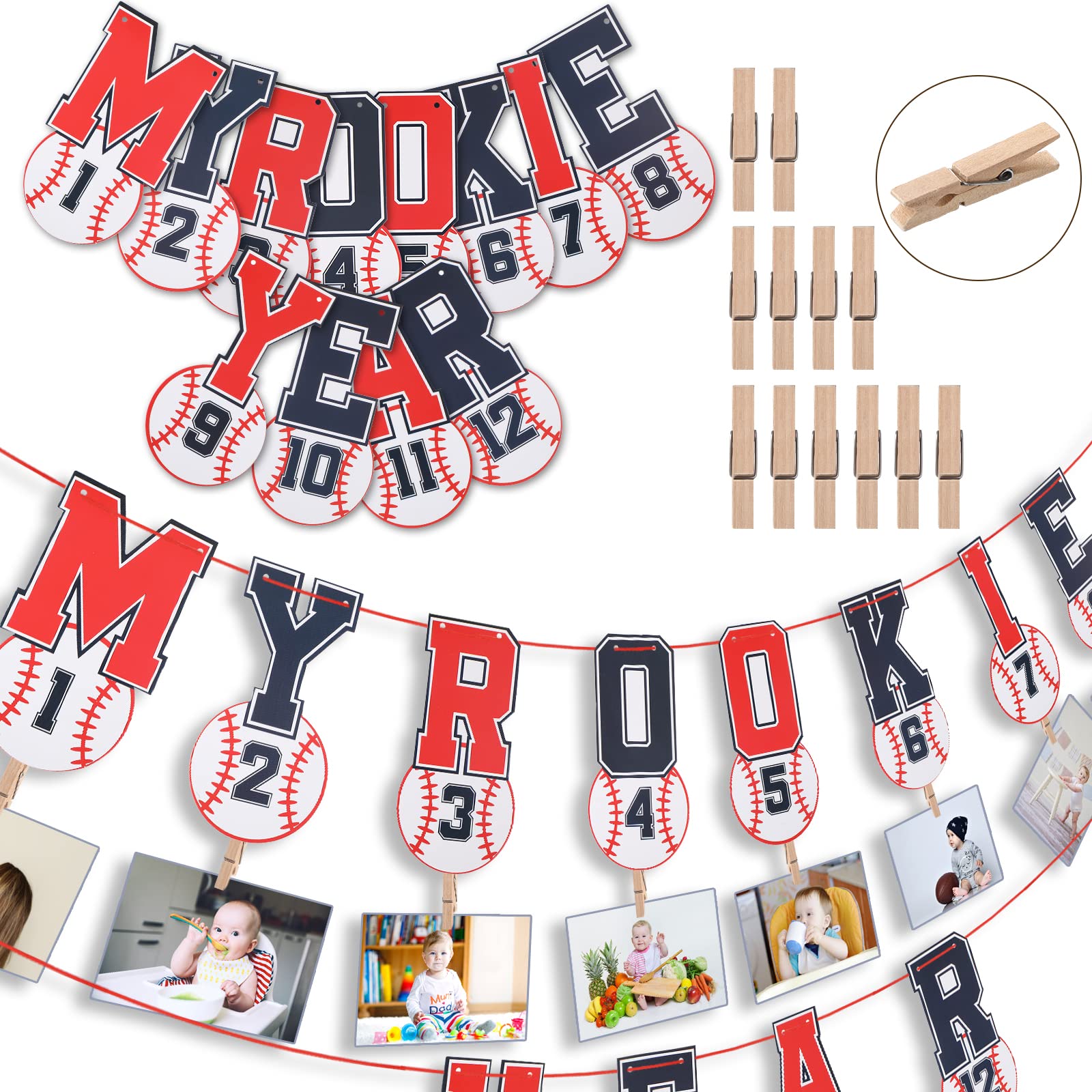 Baseball Themed Party Banner Set: the package comes with a total of 2 baseball themed party decorations, including 1 pre strung baseball themed My Rookie Year 1st monthly photo birthday banner with 13 wooden photo clips and 20 dot stickers, 1 baseball themed ONE highchair banner; An ideal combination to satisfy your birthday party decoration needs
