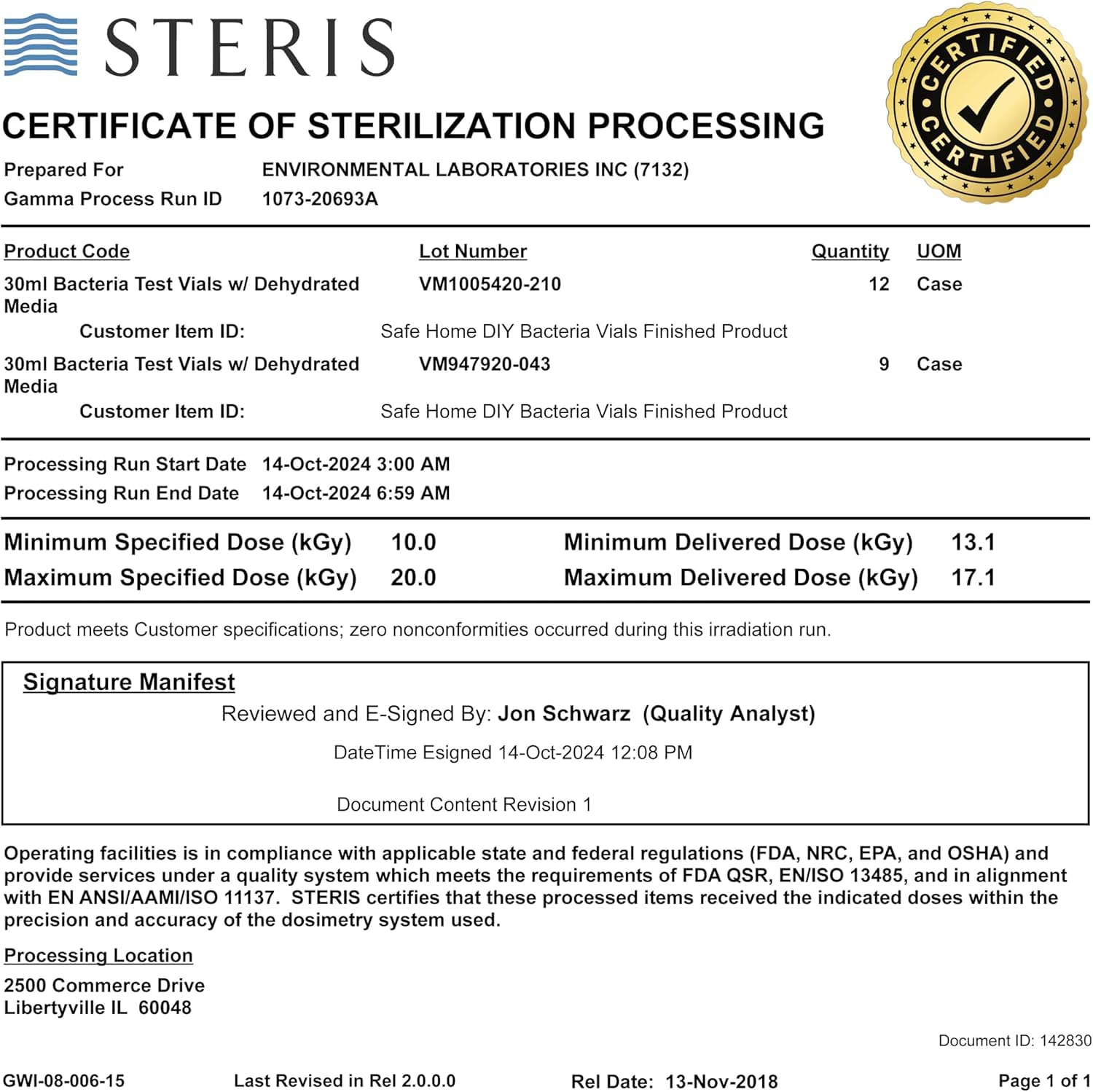 3RD PARTY STERILIZATION: Every Safe Home kit is sterilized by a certified facility (see attached certificate) and guaranteed to be “free from bacteria” before you test. This process assures zero “false positive results” from product contamination, as may be experienced with other kits who skip this sterilization process.