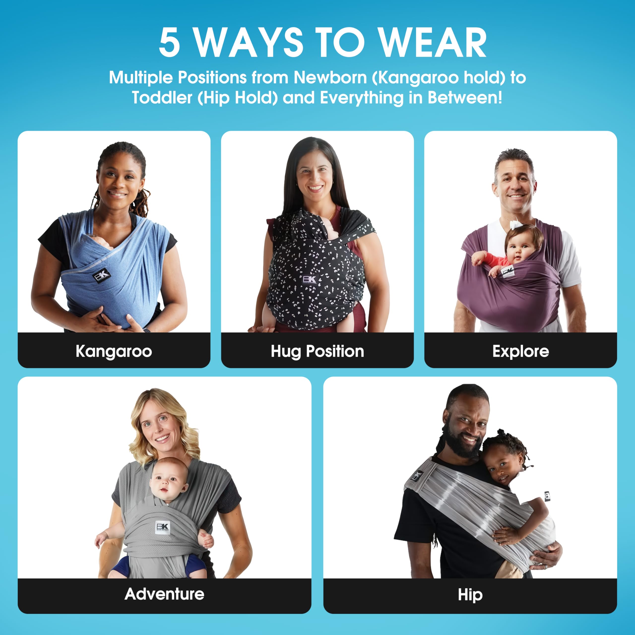 [5 POSITIONS to WEAR BABY]: Our infant carrier wrap grows with your child - choose the best position from SWADDLE wrap hold for preemies & newborn babies, to an upright seated carrier for all babies up to 35lbs. A baby wrap carrier that holds newborn to toddler, it's MACHINE washable & DRYER safe, and a top choice for baby items must-haves on your baby registry. (Under 8 lbs., consult medical professional)
