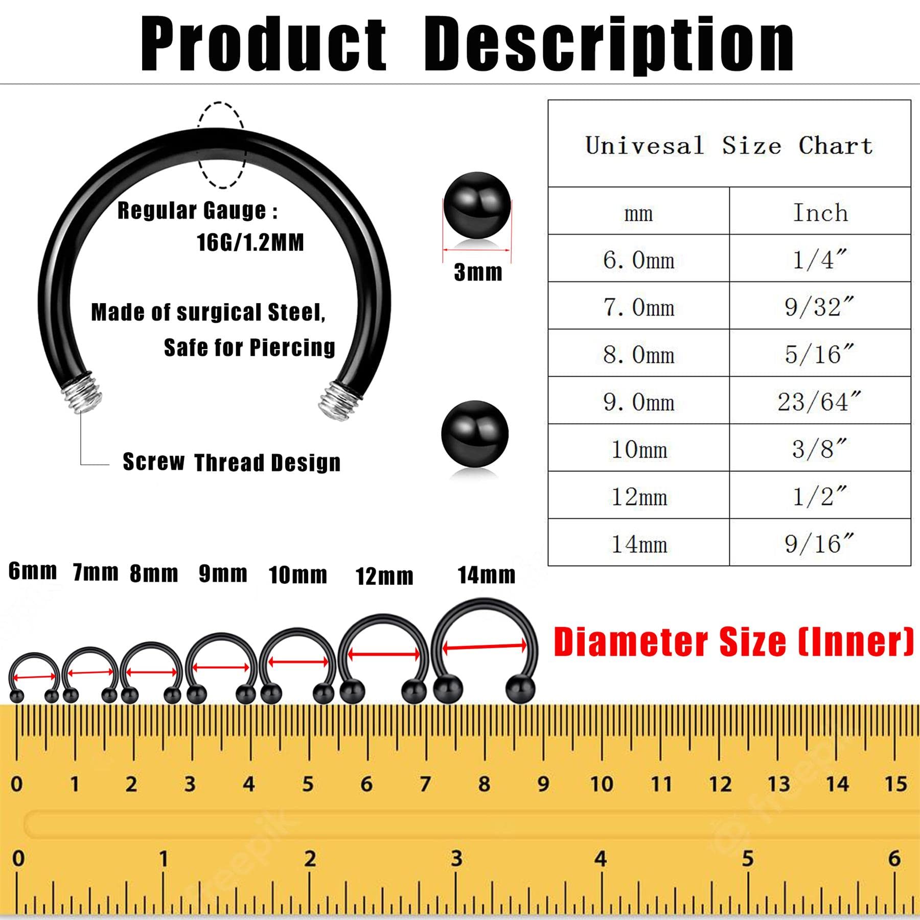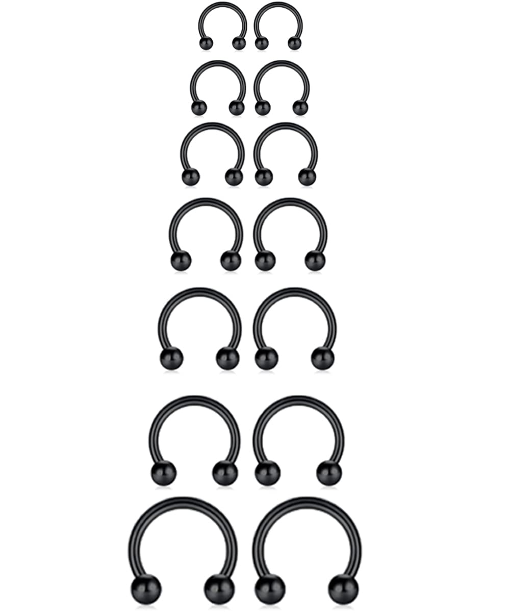 【7 PAIRS of 16G HORSESHOE RINGS SET in DIFERENT SIZES】Regular gauged: 16Ga/1.2mm, Ball size : 3mm, Inner diameter of hoops from 6mm, 7mm, 8mm, 9mm, 10mm, 12mm and 14mm; Different size of small body piercing jewelry multipack for multiple pircing, Good chioce for septum, smiley, nose, nostril, lip and labret piercing, Also practical as cartilage earrings, helix earrings, tragus earrings, rook earrings and daith earrings