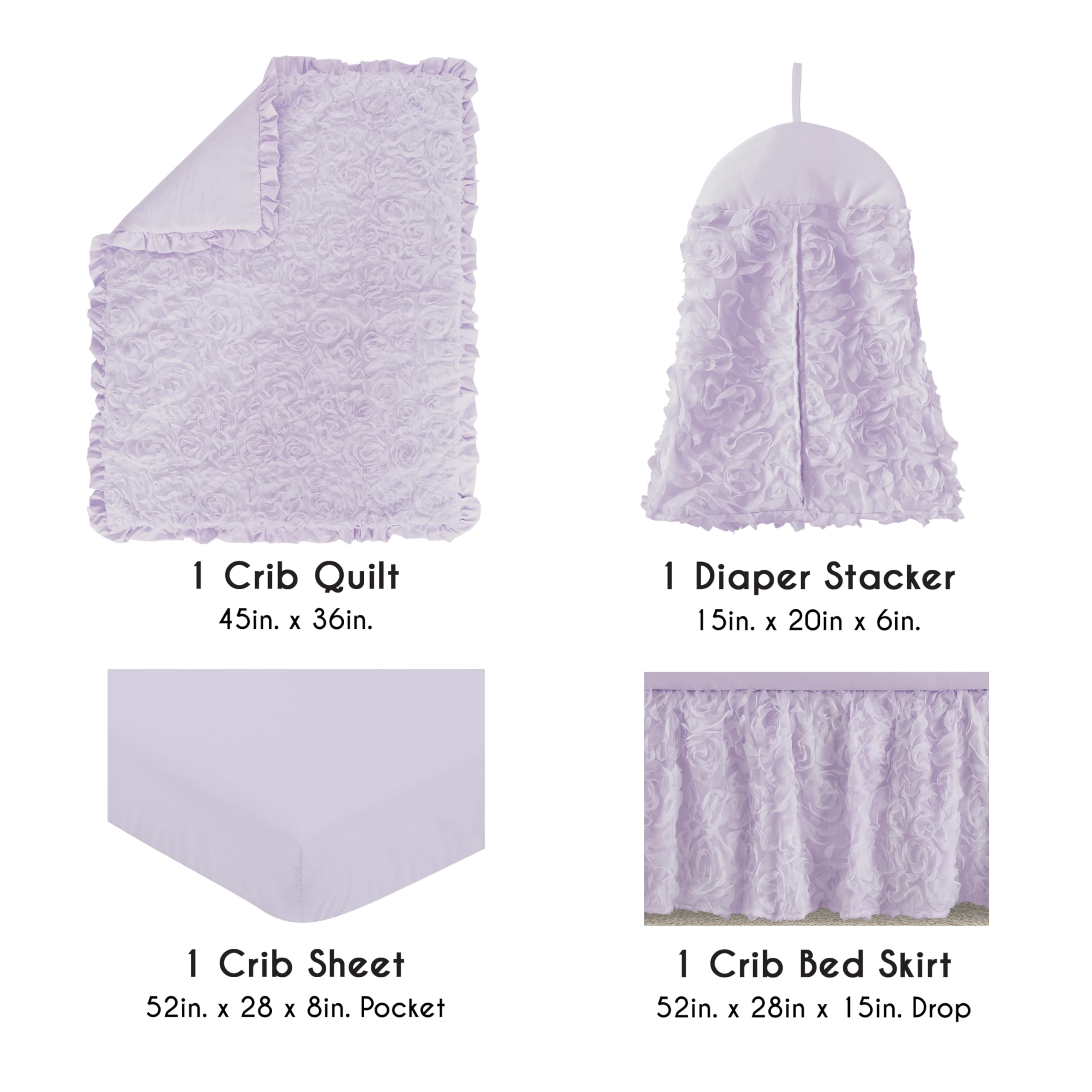 4 PIECE CRIB BEDDING SET INCLUDES: Crib Comforter (45in. x 36in.), Fitted Crib Sheet (52in. x 28in. x 8in. Pocket), Crib Skirt (52in. x 28in. x 15in. Drop) and Diaper Stacker (15in. x 20in. x 6in.). An infant crib set including all the baby essentials is a great value compared to purchasing pieces separately. This baby crib set is made of soft microfiber fabric & features a solid light lavender purple color palette to bring your luxurious vintage flower boho roses high end baby room together.