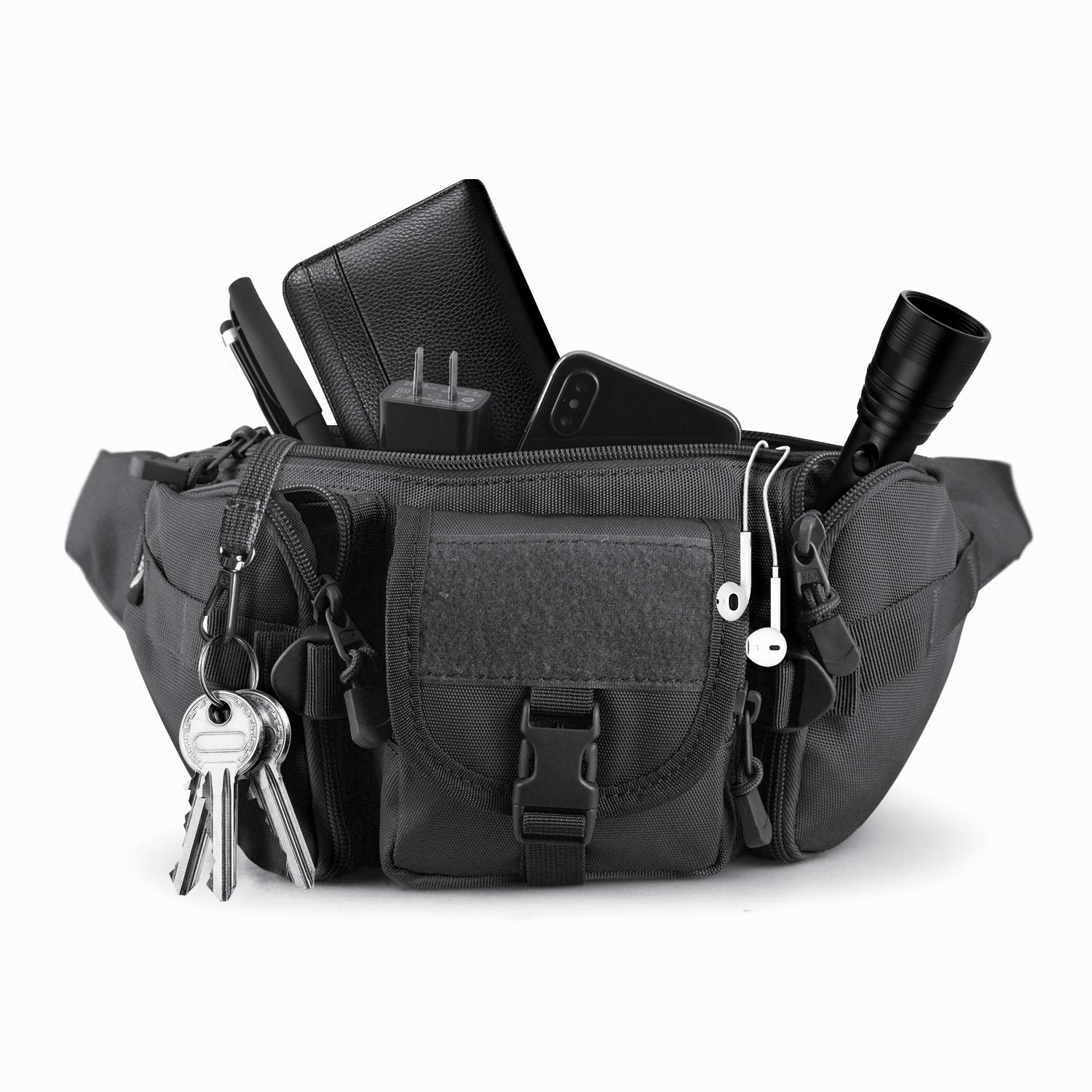 Five different sizes pockets fully meet your basic outdoor needs. The LARGE MAIN COMPARTMENT is big enough for carrying your ipad mini, cell phone, MP3, glasses, tactical flashlight, compass, kettle, cigarette, snacks, umbrella etc. The zippered BACK POCKET is hidden for extra protection about your passport, ID card, Credit card, wallet and essential stuffs. Three front pockets can be used to save your gadgets, small parts.